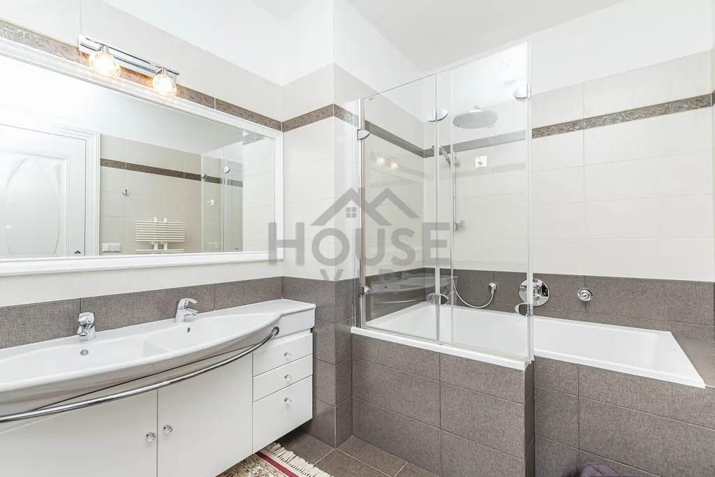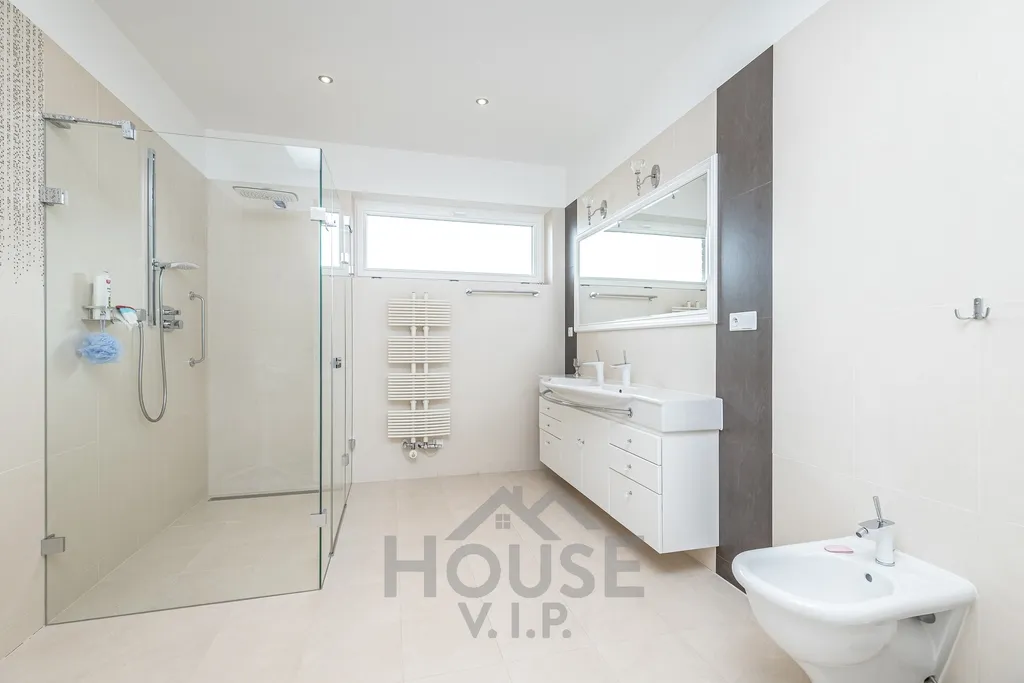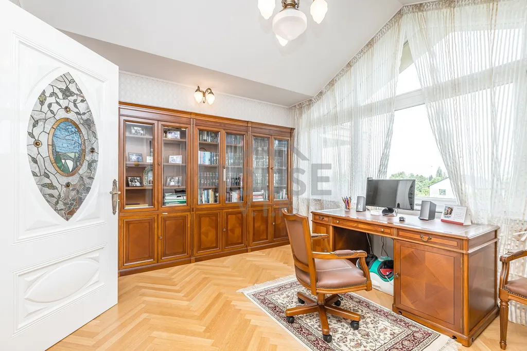 Dále se v patře nacházejí 2 velké zařízené ložnice, každá s vlastní koupelnou, a dobře vybavená pracovna s archivem, technické místnosti - žehlírna s úložnou skříní.