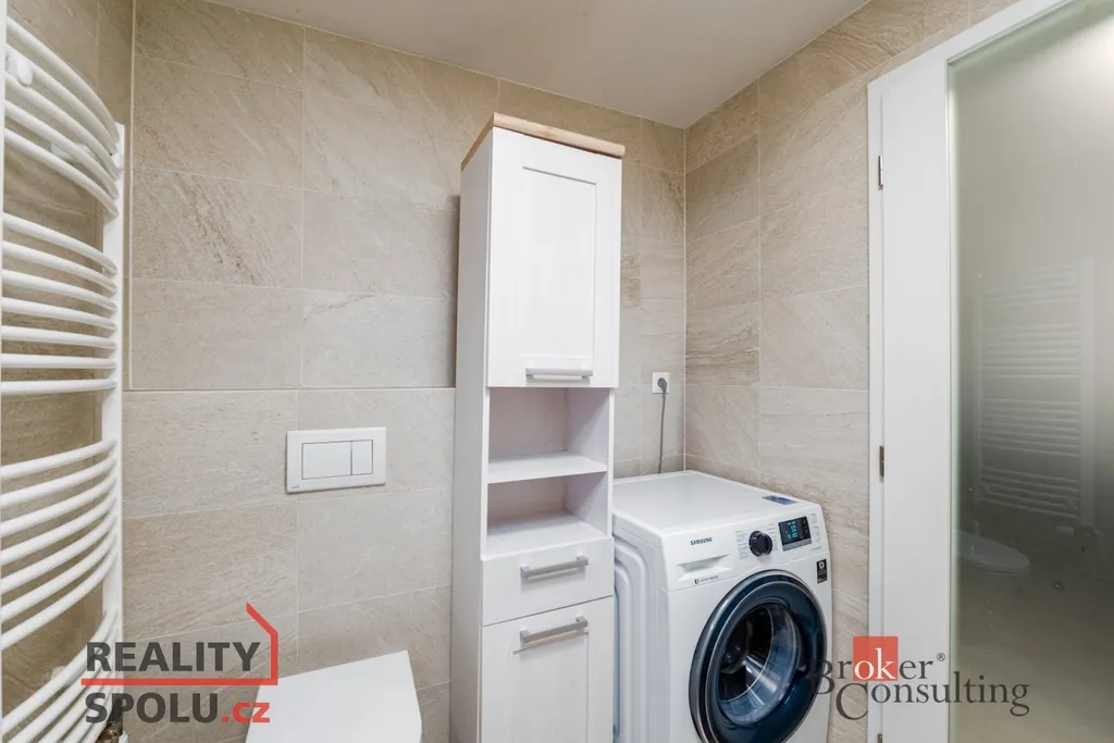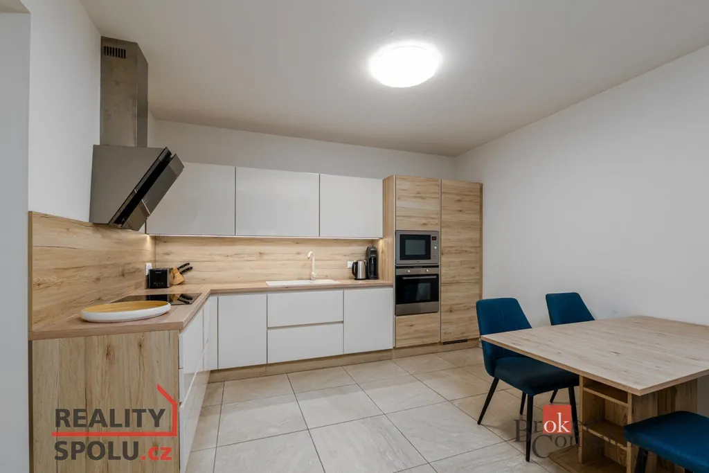 Byt je vybavený – kuchyňskou linkou se všemi spotřebiči (varná deska, trouba, myčka, lednice, mikrovlnná trouba, digestoř), obývací pokoj se sedací soupravou, TV stěnou a jídelním stolem, ložnice s postelí a nočními stolky, koupelna s vanou a pračkou.