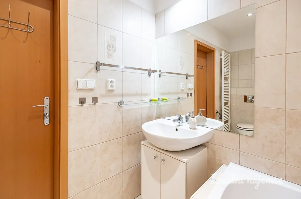 Byt se nabízí plně vybavený. Kuchyně disponuje lednicí, myčkou, elektrickou troubou, indukční varnou deskou, mikrovlnnou troubou a digestoří. Obývací část je zařízena pohovkou, konferenčním stolem, televizním stolkem s televizí a jídelním stolem s dvěma židlemi. Součástí ložnice je postel s matrací, noční stolek, pracovní stůl se židlí a šuplíky. V koupelně je vana, umyvadlo, pračka a toaleta. V předsíni je vestavěná šatní skříň a botník.