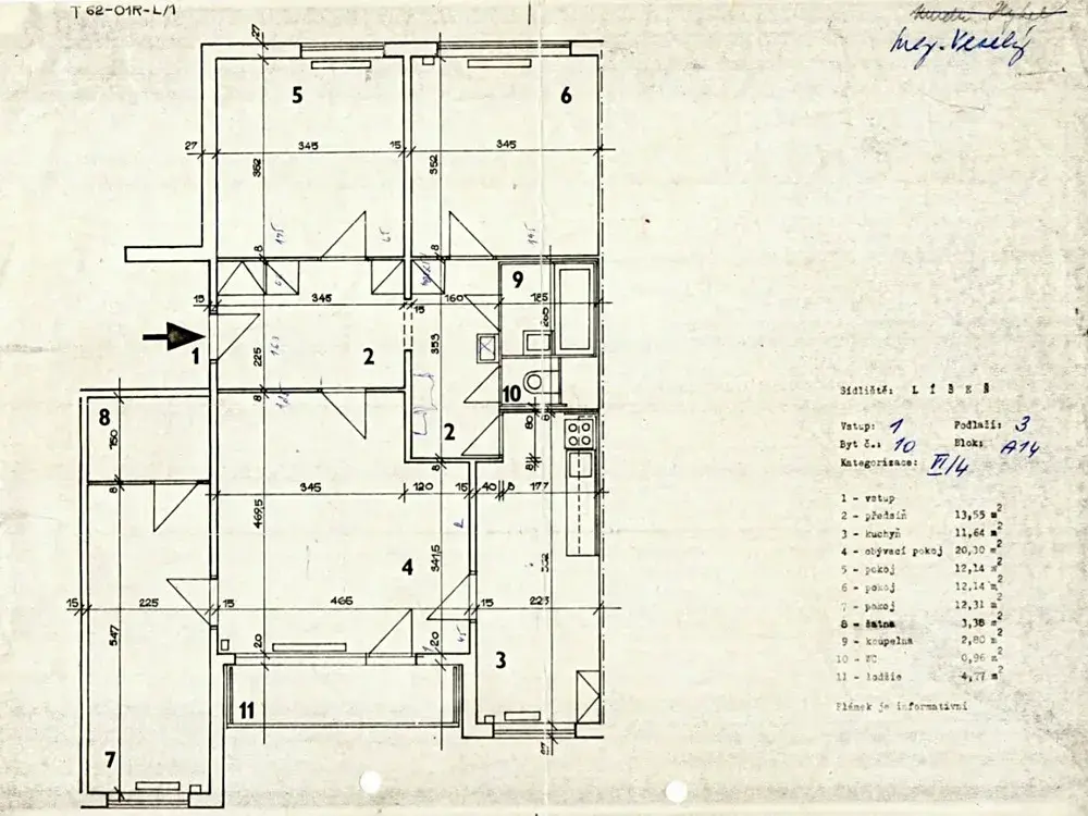 Dispozice: kuchyně 9 m², obývací pokoj 21 m² se vstupem na prostornou lodžii 5 m², tři pokoje, každý s rozlohou 13 m², dva mají samostatné vstupy, velká předsíň, koupelna s vanou, toaletní skříňka, zrcadlo, samostatné WC, k dispozici sklep.