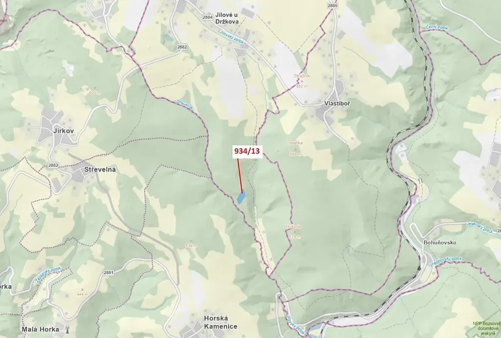 Lesní pozemek o výměře 6 213 m2, parcelní číslo 934/13, podíl 1/1, katastrální území Jílové u Držkova, obec Jílové u Držkova, obec s rozšířenou působností Železný Brod, okres Jablonec nad Nisou, Liberecký kraj.