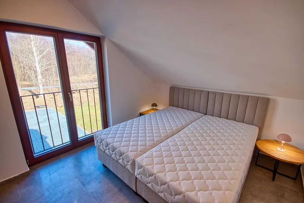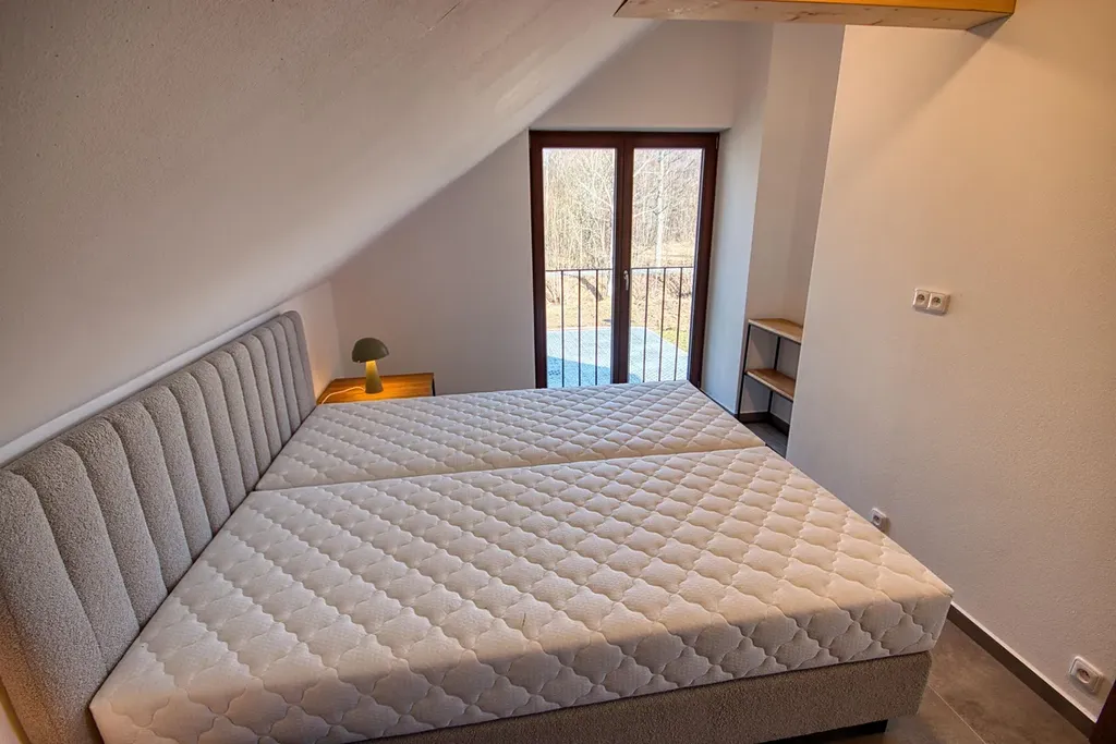 Obě ložnice působí vzdušně a světle díky šikmým stropům otevřeným až ke krovu, které jsou ozdobeny masivními trámy. Velká dřevěná francouzská okna poskytují dostatek přirozeného světla a nádherné výhledy do okolní přírody. Také koupelna je vybavena velkými okny, což zajišťuje dostatek světla a přirozené větrání.