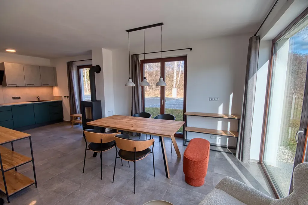 Exkluzivně nabízíme chalupy s apartmány s dispozicí 3+kk, v 1. a 2. NP, s užitnou plochou 70,52 m2, terasou (9 m2) a předzahrádkou (cca 100 m2), v domě se třemi bytovými jednotkami. Vstup do dolní části domu vede přes samostatný vchod, který ústí do vstupní chodby se schodištěm vedoucím do horního patra. Pod schodištěm je umístěn menší úložný prostor, vedle něhož se nachází samostatná toaleta.