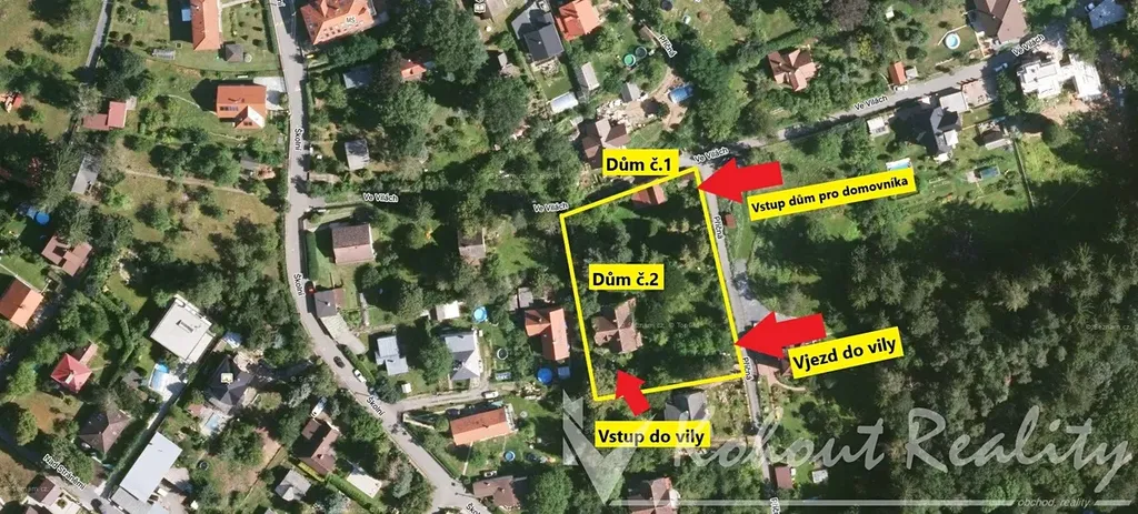 celková výměra pozemku: 2 778 m2, zahrada: 2 501 m2, zastavěná plocha vily: 168 m2, zastavěná plocha domu zahradníka: 109 m2