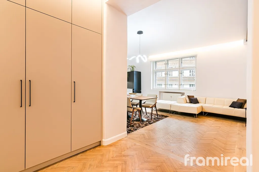 Dominantou je prostorný obývací pokoj propojený s moderní kuchyňskou linkou vybavenou vestavnými spotřebiči – americkou lednicí, myčkou, varnou deskou s integrovaným výsuvným odsavačem par (downdraft) a dalšími prvky, které zajišťují pohodlné každodenní užívání. Zapuštěná LED svítidla v podhledech podtrhují elegantní atmosféru celého interiéru. V rámci rekonstrukce byly použity kvalitní povrchové materiály, včetně designové stěrky a renovovaných parketových podlah, které dodávají prostoru nadčasový a harmonický charakter.