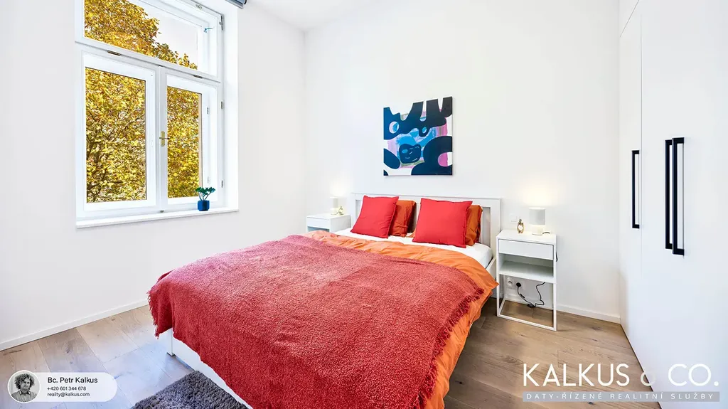 Byt právě prošel citlivou rekonstrukcí v nadstandardním provedení, které spojuje historický šarm s moderním komfortem. Výška stropů 3,2 m, interiérové dveře v plné výšce 210 cm a interiér v jemných světlých tónech dodávají prostoru vzdušnost, eleganci a klid. Každý detail byl promyšlen — od dřevěných podlah a špaletových oken s trojsklem až po vestavěné skříně a kuchyň až do stropu. Podlahové vytápění zajišťuje příjemné teplo, v létě komfort doplní klimatizace a elektricky ovládané stínění.