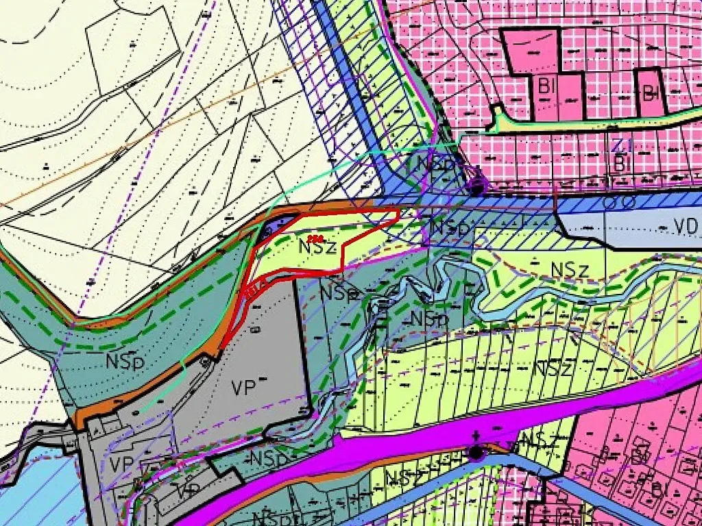 pozemky vedeny jako trvalý travní porost a navazují na zastavěné území - plocha výroby a skladování,