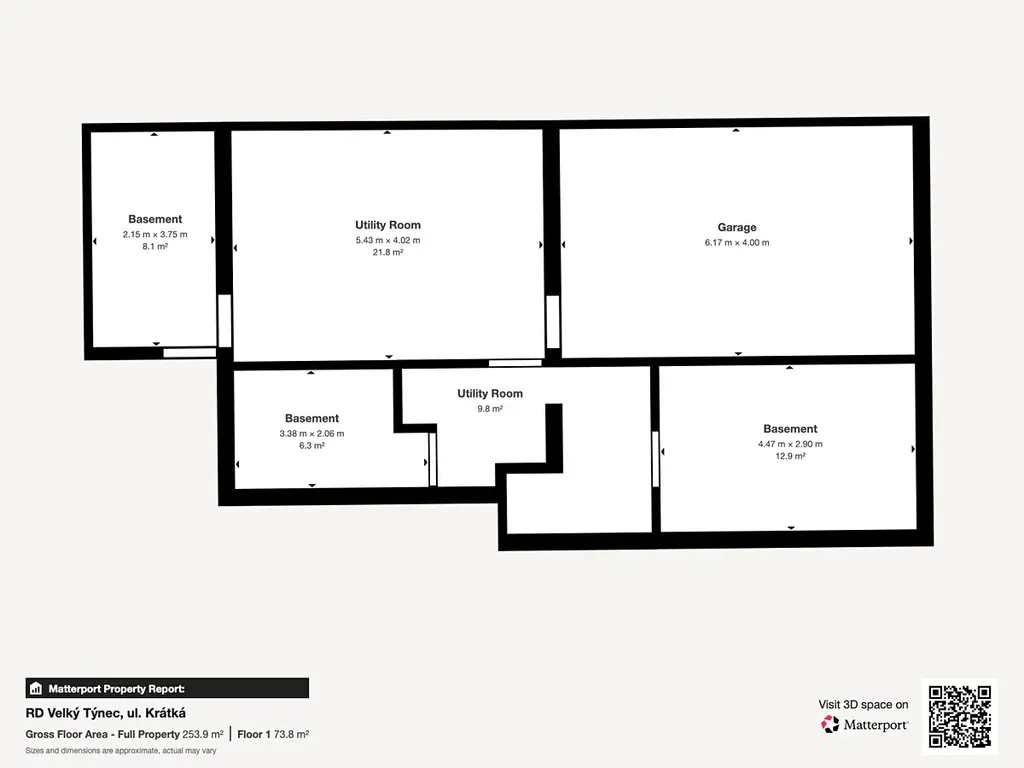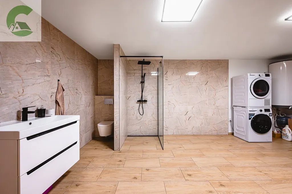 - Suterén poskytuje několik praktických místností včetně velké části předpřipravené pro domácí wellness (nové dlažby, obklady, sprchový kout a WC), dále technickou místnost, sklad se vstupem na zahradu a garáž v rámci hlavní stavby.