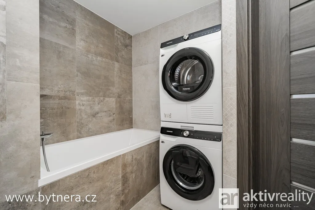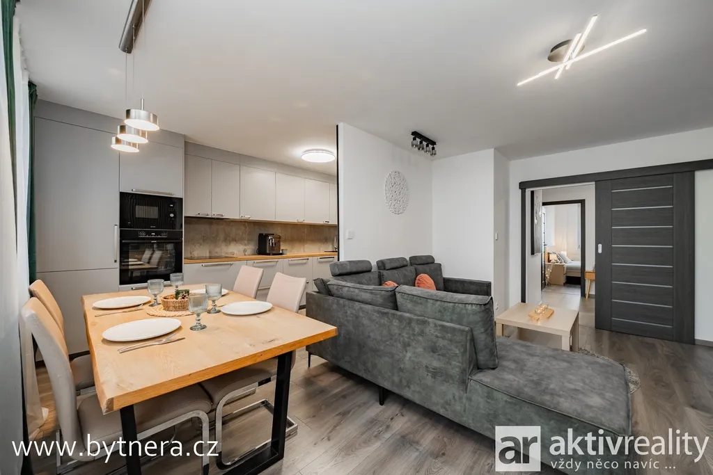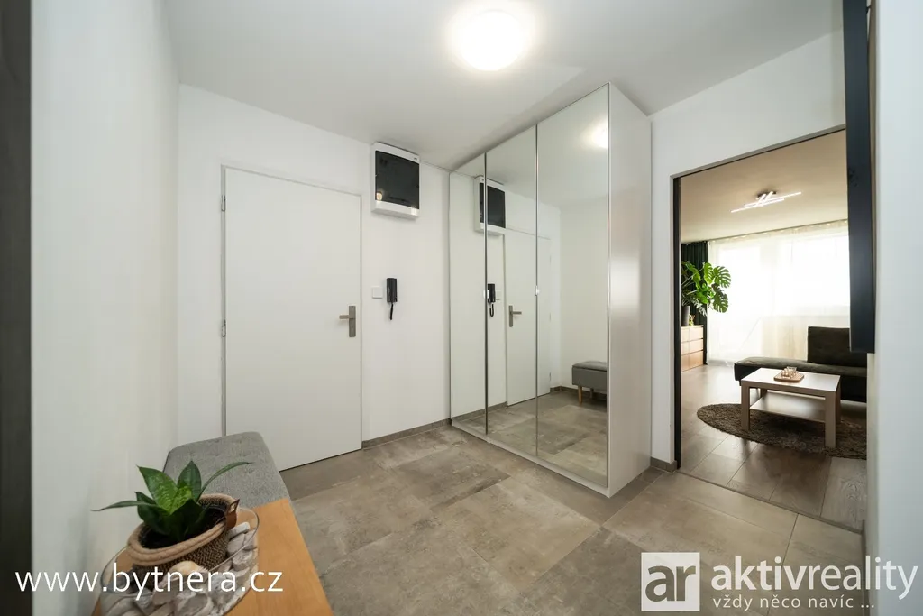 Disponuje světlým obývacím pokojem s jídelním koutem a vstupem na zasklenou lodžii. Kuchyně je vybavena novou moderní kuchyňskou linkou se zabudovanými spotřebiči a nabízí dvě praktické špajzy. K dispozici jsou dále dva samostatné pokoje – ložnice a dětský pokoj – s příjemným výhledem do okolí. Prostorná moderní koupelna je vybavena vanou a přípojkou na pračku, přičemž zde zůstal dostatek místa i pro sušičku.