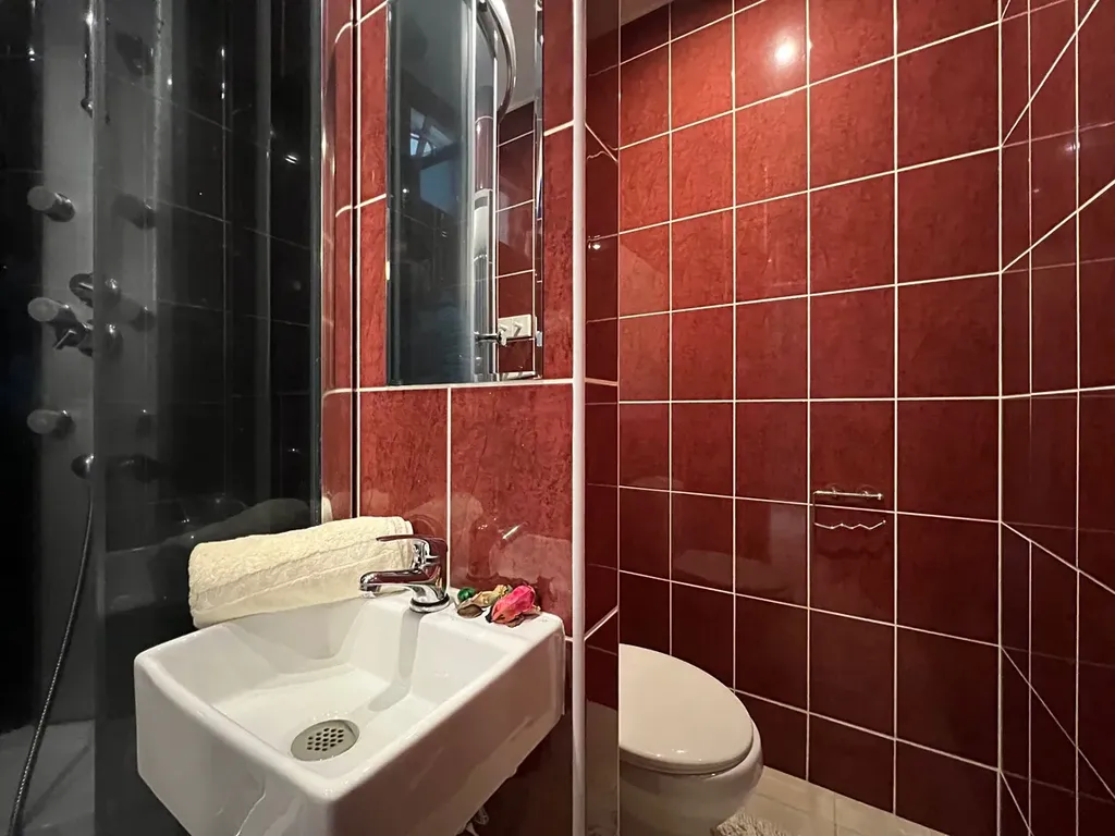 Koupelna se sprchovým koutem, toaleta je součástí koupelny, oddělená příčkou.