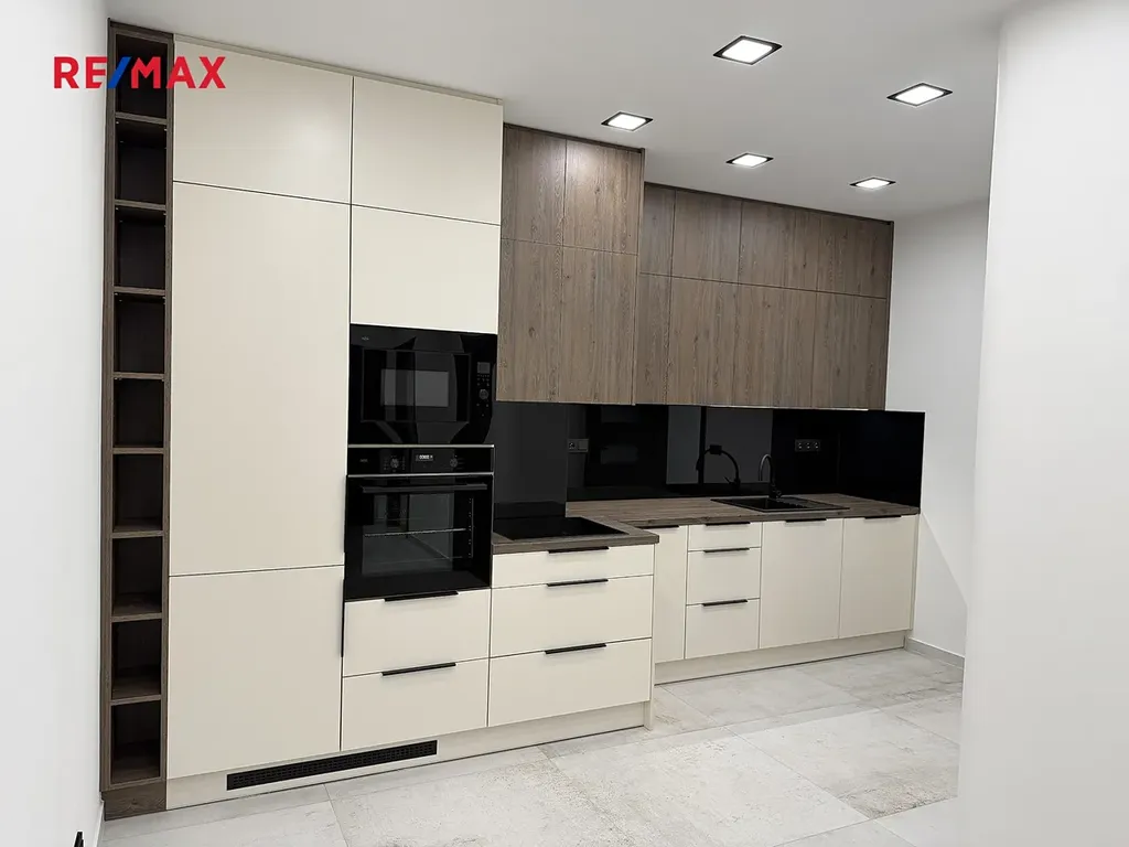 Dominantou bytu je moderní kuchyňská linka na míru, plně vybavená spotřebiči: