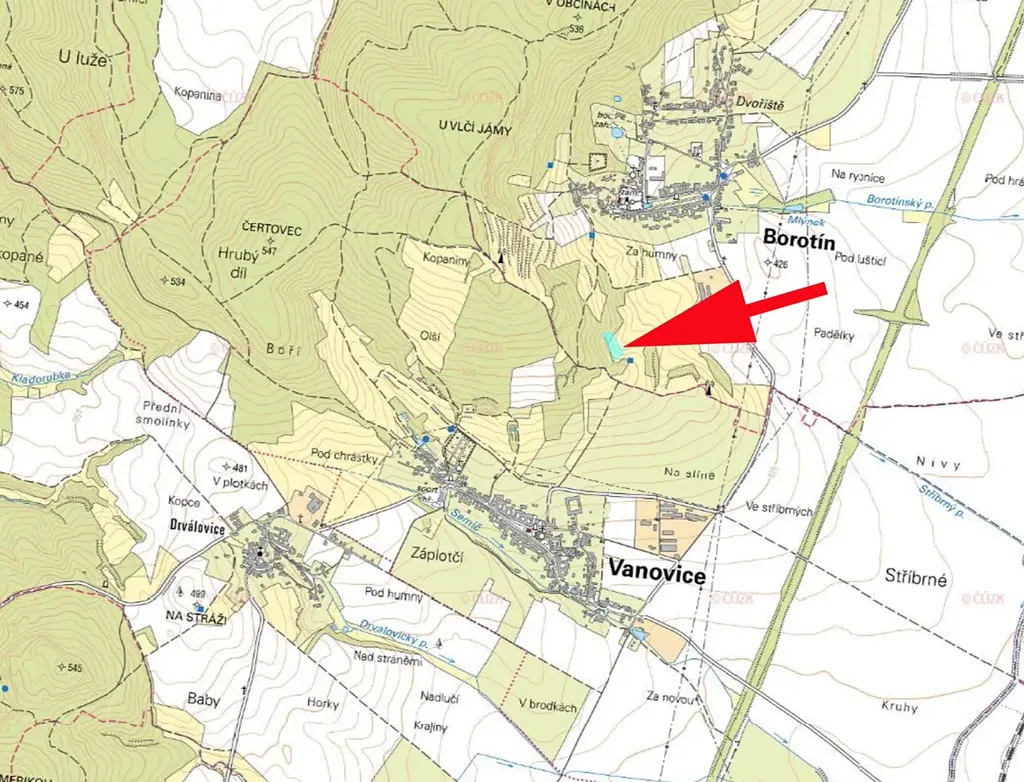 Prodáme pozemek, louku s několika stromy (zejm. borovice, možno kácet) v k.ú. Borotín u Boskovic, parc.č. 5486,