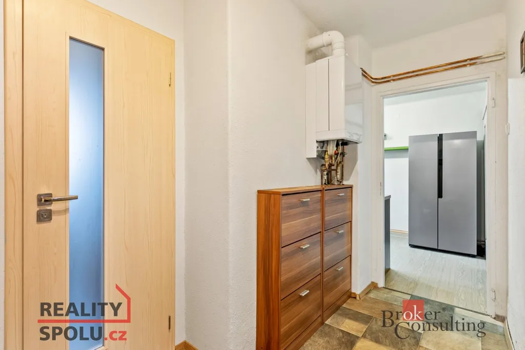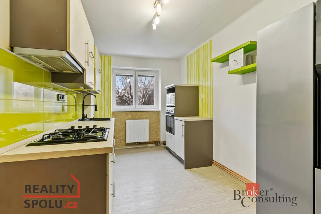 Byt má prakticky řešený vstupní prostor, který plynule propojuje obytnou část. Kuchyň je vkusně řešena v kombinaci bílé kuchyňské linky a jemných zelených tónů, které prostoru dodávají svěží a příjemnou atmosféru. Na kuchyň navazuje prostorný obývací pokoj s dostatkem místa pro jídelní stůl, ideální pro rodinné stolování i posezení s přáteli. Dále se v bytě nachází ložnice a koupelna spojená s WC. Byt působí světlým, čistým a útulným dojmem. K bytu náleží také sklep o velikosti 5 m², který poskytuje dostatek úložného prostoru.