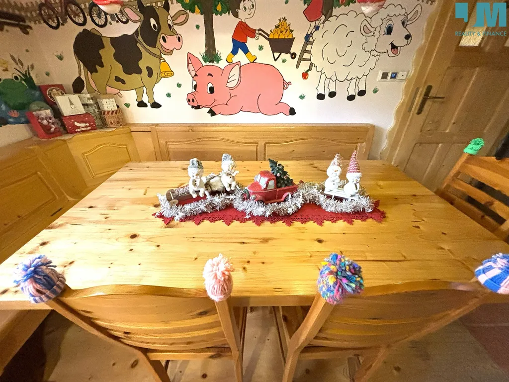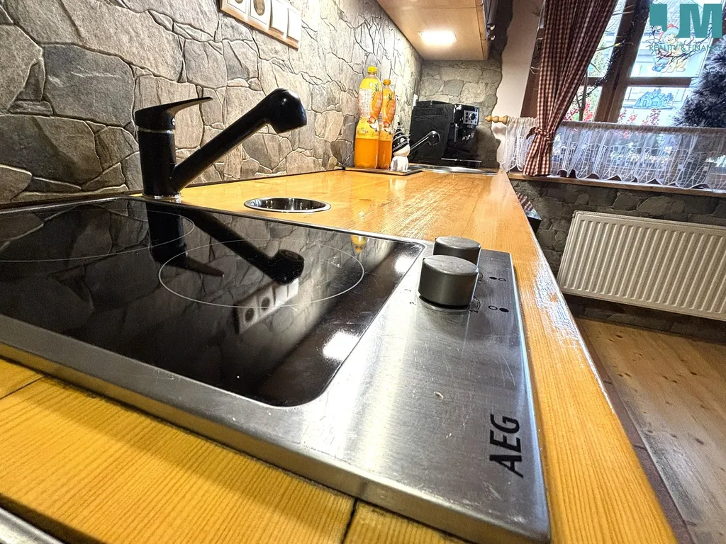 Kuchyně je laděná do přírodního, rustikálního stylu s masivním dřevem, krásnými obloukovými okny a originálními malovanými detaily. Součástí je i kamnový sporák na tuhá paliva, který dotváří příjemnou domácí atmosféru.