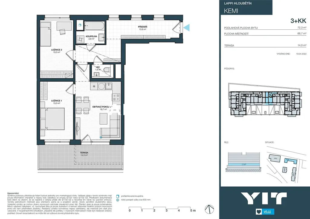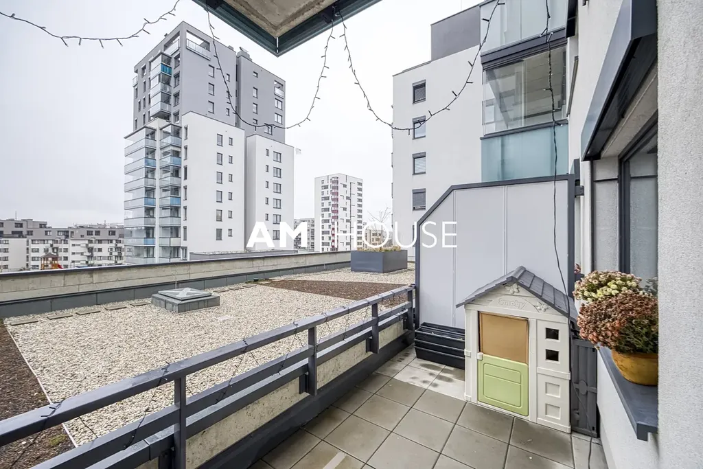 Společnost „Am House“ v exkluzivním zastoupení majitele nabízí k prodeji moderní byt 3+kk o ploše 72 m², doplněný o terasu o velikosti 14 m². Byt se nachází v 2. NP rezidenčního projektu KEMI Hloubětín, na adrese Kolbenova 1177/56 Praha 9.
