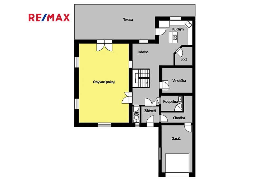 Dispozice přízemí - velmi prostorný obývací pokoj s krbem a vstupem na terasu, kuchyň s kuchyňskou linkou, pultem, jídelnou a spižírnou. Vstupní hala s chodbou do garáže a nechybí koupelna a WC. Fajnovostí domu je domácí vinárna.