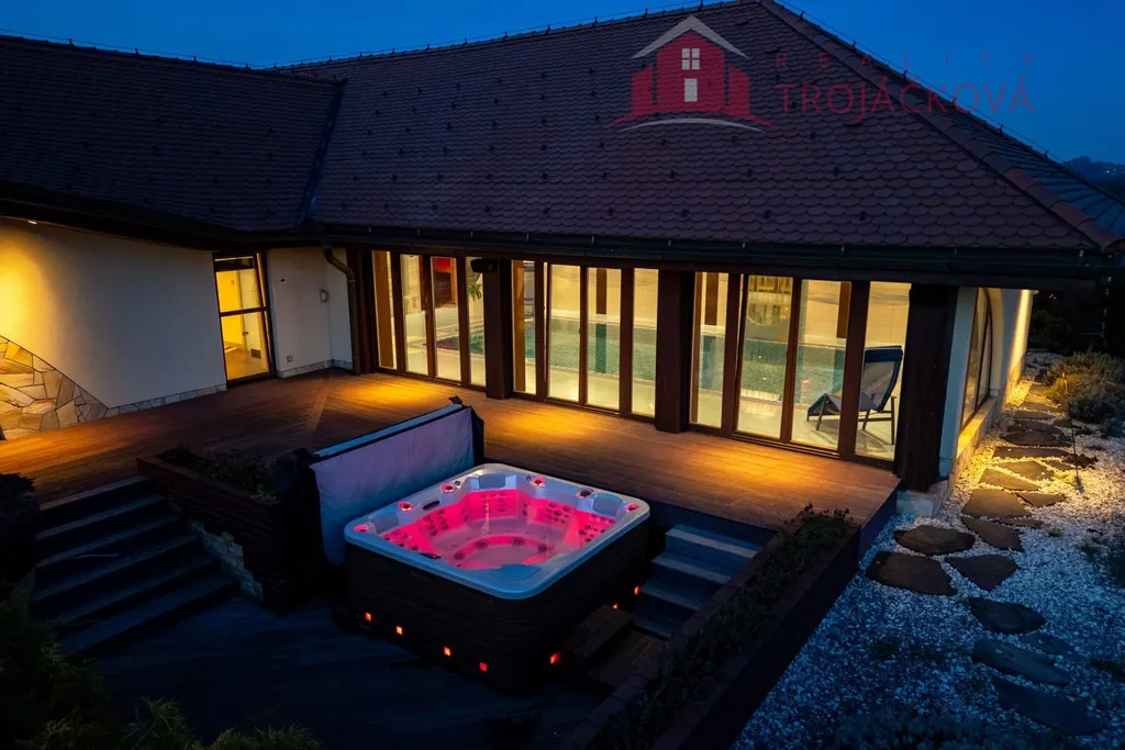 Přízemí se sestává z velkého obývacího pokoje propojeného s otevřenou jídelnou a kuchyní o ploše téměř 97 m2, kde se kombinuje moderní design s praktičností. Z obývací pokoje je vstup do zimní zahrady, je zde je krb a vestavěné mořské akvárium (800 l). Jídelna a obývací pokoj jsou vybaveny stropními designovými svítidly Swarovski. Na obývací pokoj navazuje moderní kuchyně vybavená kvalitními spotřebiči Miele, Liebherr a DeDietrich. Ze zádveří se vstupuje do technické místnosti a do haly a po obloukovém schodišti se z ní vychází do podkroví. Z haly je také vstup do pracovny, WC a ložnice. Na ložnici navazuje koupelna, která je průchozí a je z ní přístup do relaxační části objektu, kde se nachází vyhřívaný bazén s protiproudem (OXY systém) s vodní plochou 4x 8 m, finská sauna - vše s plně automatizovanou bazénovou technologií. Dále navazuje chodba s WC a sprchovým koutem. Z prostoru u bazénu je přímý vstup k vířivce a do zahrady. V podkroví se nacházejí tři pokoje, koupelna a WC. Součástí objektu je garáž se stáním pro 2 osobní automobily. Další dvougaráž je, jako samostatná stavba vedle domu spolu s hosp. budovou.