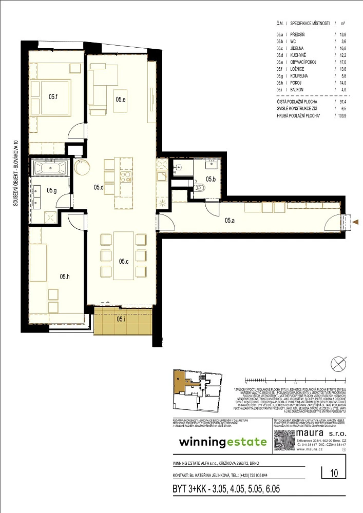 Orientace oken vůči světovým stranám je v případě tohoto bytu dvojí - na jihovýchod do vnitrobloku a na severozápad do ulice Slovákova, což zajistí příjemnou proměnlivost světelných podmínek během dne. Součástí bytu jsou také dvě koupelny, aby si přišli na své jak milovníci dlouhých koupelí, tak i ti, kteří preferují sprchový kout.