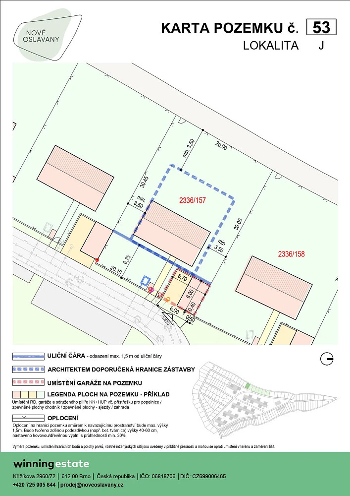 V rámci projektu Nové Oslavany nabízíme k prodeji stavební pozemek č. 53 (parc. číslo 2336/157) o výměře 604 m². Na pozemku si můžete postavit dům inspirovaný návrhy renomovaných architektů studia K4, které zpracovalo celý koncept lokality, nebo si můžete nechat naprojektovat dům dle Vašich představ v souladu s parametry územního plánu uvedenými na kartě pozemku.