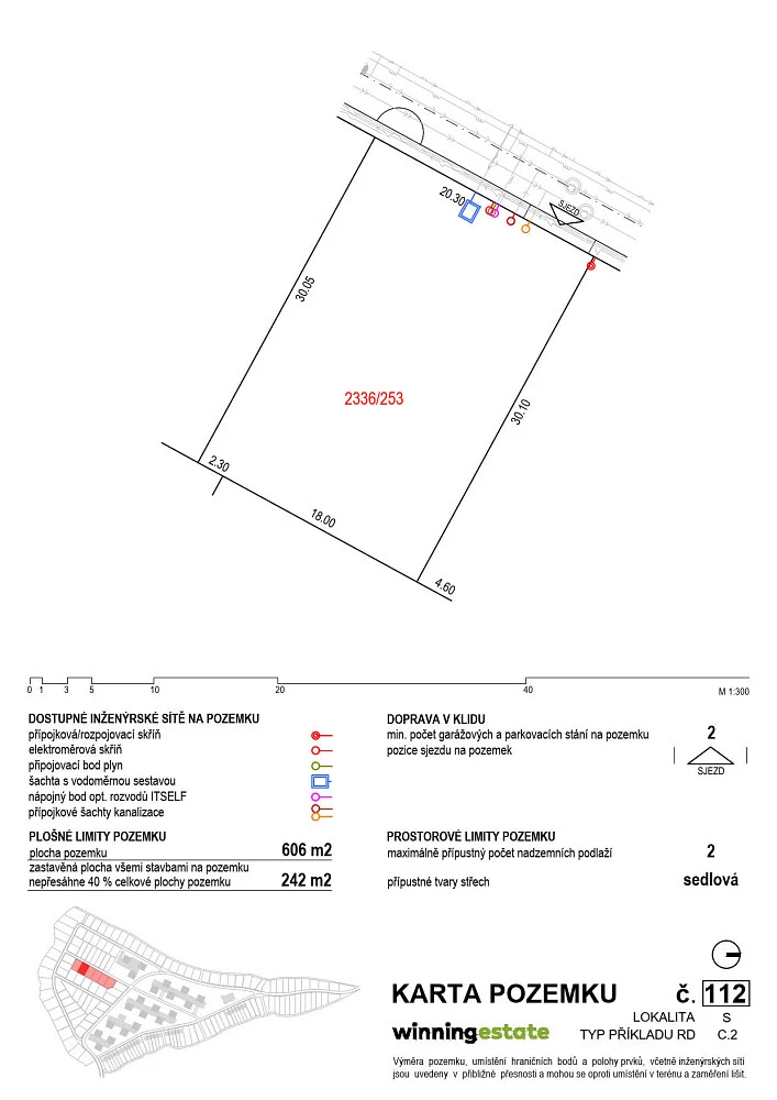 V atraktivní lokalitě Oslavan nabízíme k prodeji stavební pozemek č. 112 (parc. číslo 2336/253) o výměře 606 m². Inženýrské sítě, resp. jejich připojovací body budou přivedeny na hranici pozemku.