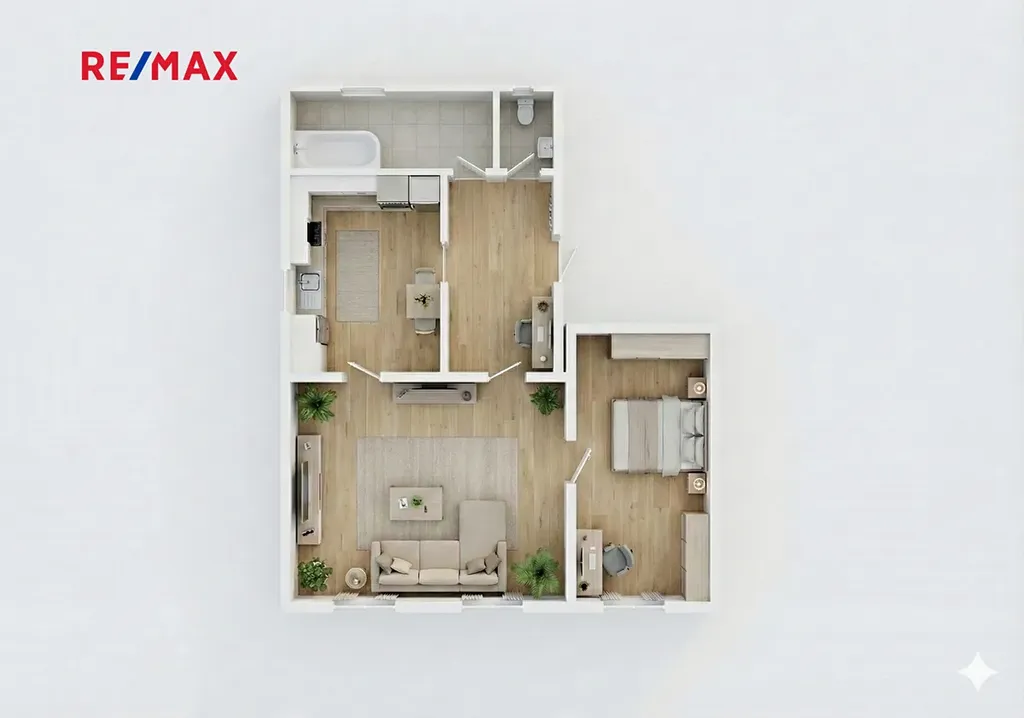 Dispozičně nabízí byt dvě samostatné, prostorné místnosti, velkou kuchyň s oknem, zděnou a nadstandardně velkou koupelnu, kde si bez problémů umístíte i pračku, sušičku nebo stylový nábytek. Toaleta je zvlášť.