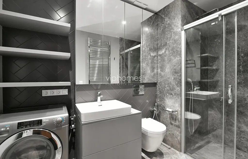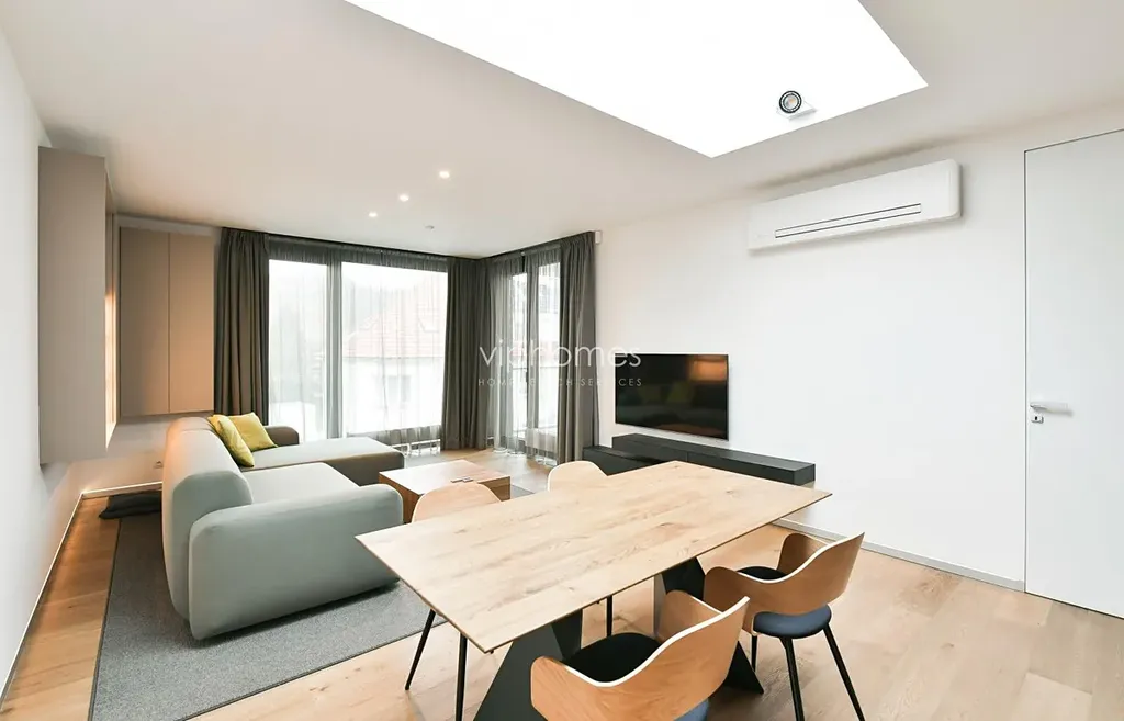 Interiér bytu nabízí prostorný obývací pokoj moderně propojený s kuchyňským koutem, vstup na lodžii (9 m2), dále ložnici, šatnu, koupelnu se sprchovým koutem, 2 x WC a vstupní halu. Kuchyňská linka je vybavena všemi potřebnými spotřebiči (sporák, trouba, mikrovlnná trouba, lednice s mrazákem, myčka nádobí). Výhledy do zeleně, velká okna, podlahy kvalitní dřevo, podlahové topení v koupelně, regulované osvětlení, dlažba, vestavěné skříně, rozkládací sedací souprava, nádobí, skleničky, pračka a sušička. K bytu náleží sklep i garážové parkovací stání.