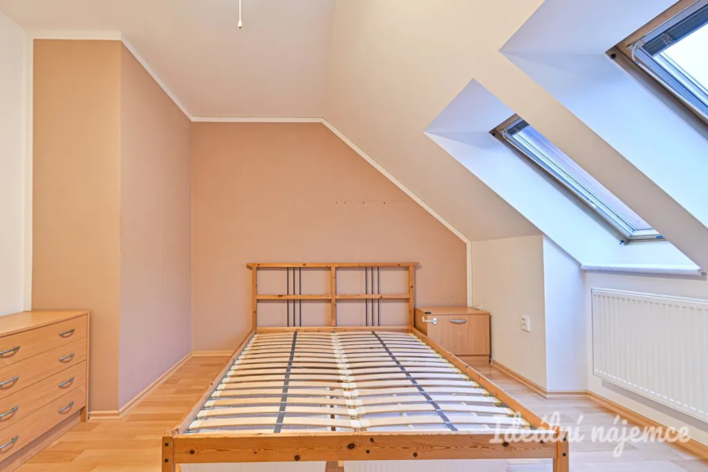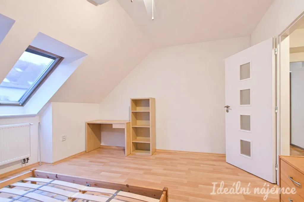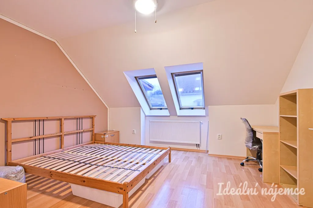 Ložnice disponuje manželskou postelí, psacím stolem a komodou. Součástí koupelny je prostorná vana, umyvadlo se skříňkou, pračka a toaleta. V chodbě nalezneme úložné prostory.