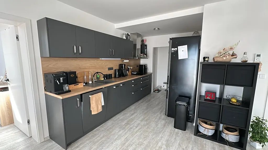 Byt je částečně vybavený a nachází ve 3. a 4. NP novostavby zděného domu s výtahem, dispozičně řešen jako 3+kk. Ve spodním patře bytu se nachází vstupní chodba , koupelna s vanou a WC, ložnice a prostorný obývací pokoj se vstupem na lodžii (8,7 m2) a schody do horního patra. V obývacím prostoru je na míru vyrobená, kompletně vybavená kuchyňská linka.