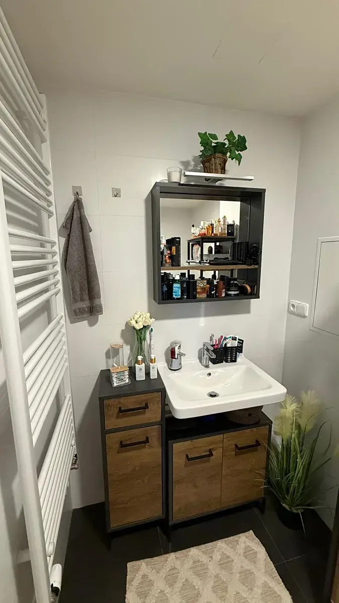 V patře bytu je pokoj, koupelna se sprchovým koutem a WC a úložný prostor. Topení ve spodním patře je podlahové, v horním radiátory.