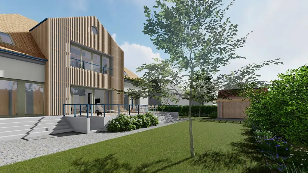 - **Exteriér:** Dům získá moderní vzhled se zajímavými dřevěnými prvky a velkými prosklenými plochami, které umožní maximální propojení interiéru s exteriérem. Navrženy jsou prostorné terasy a upravená zahrada s možností relaxační zóny.