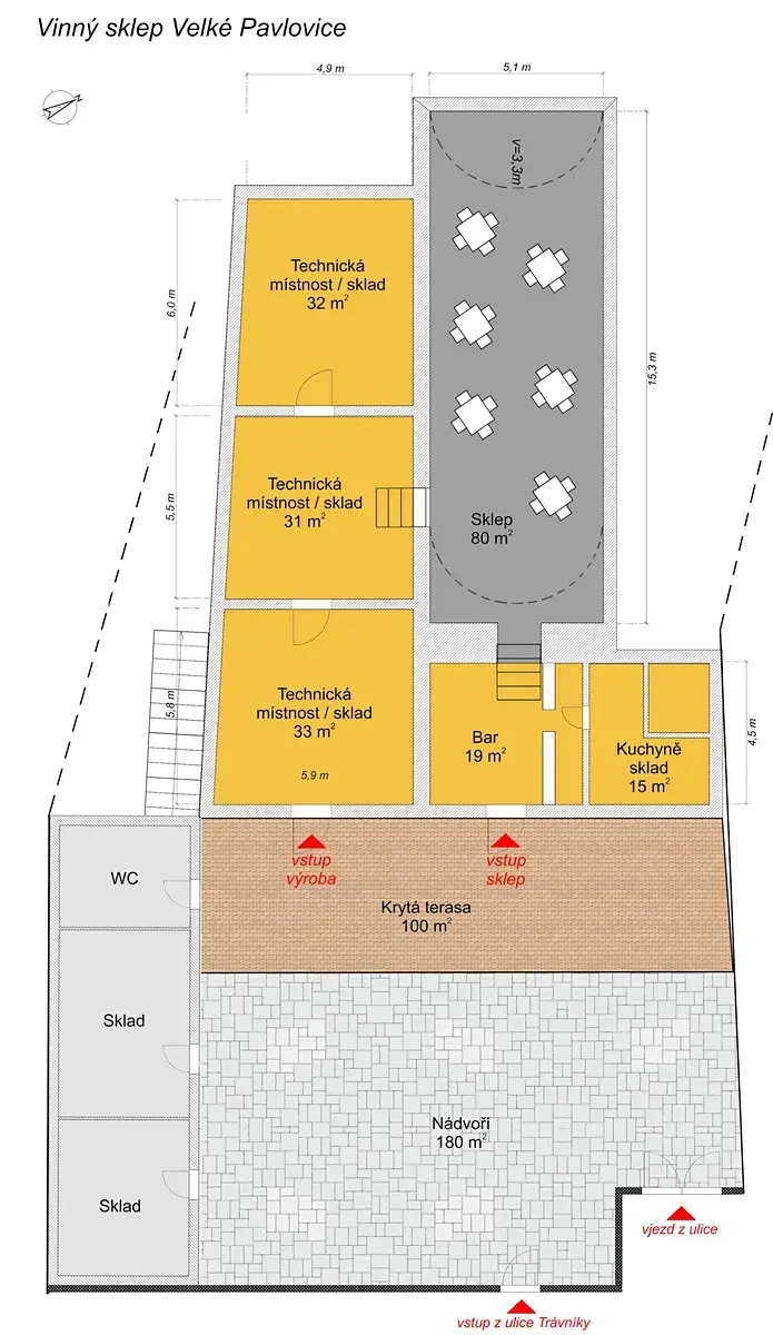 Je zpracovaný s předjednaný projekt na 3 hmoty - objekt o 4 jednotkách směrem do ulice Trávníky, střední objekt vinařství a navazujícího zázemí + ubytování pro vinaře, degustační a prezentační prostory (a samozřejmě výroba a skladování), v horní části pak objekt se 4 luxusními jednotkami s nádherným výhledem do okolí. Velkou výhodou je i možnost zajištění dostatečného počtu parkovacích stání a zároveň i případně zachování vjezdu pro manipulační vinařskou techniku.