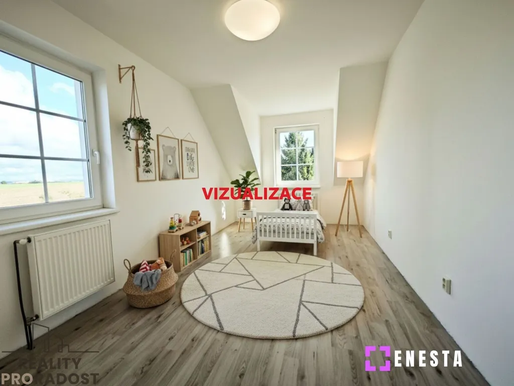 - 2. Patro: Klidová zóna s hlavní ložnicí (orientovanou do zahrady), která má vlastní šatnu a koupelnu. Dále dva dětské pokoje a samostatná koupelna a samostatné WC na chodbě.