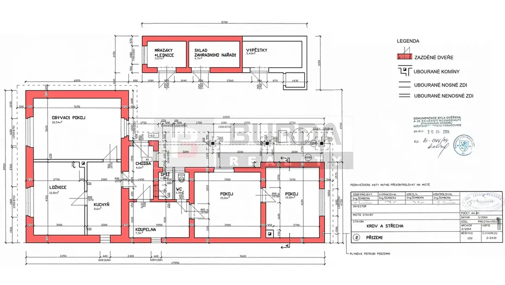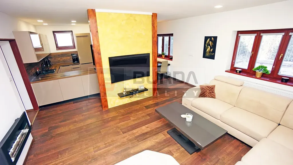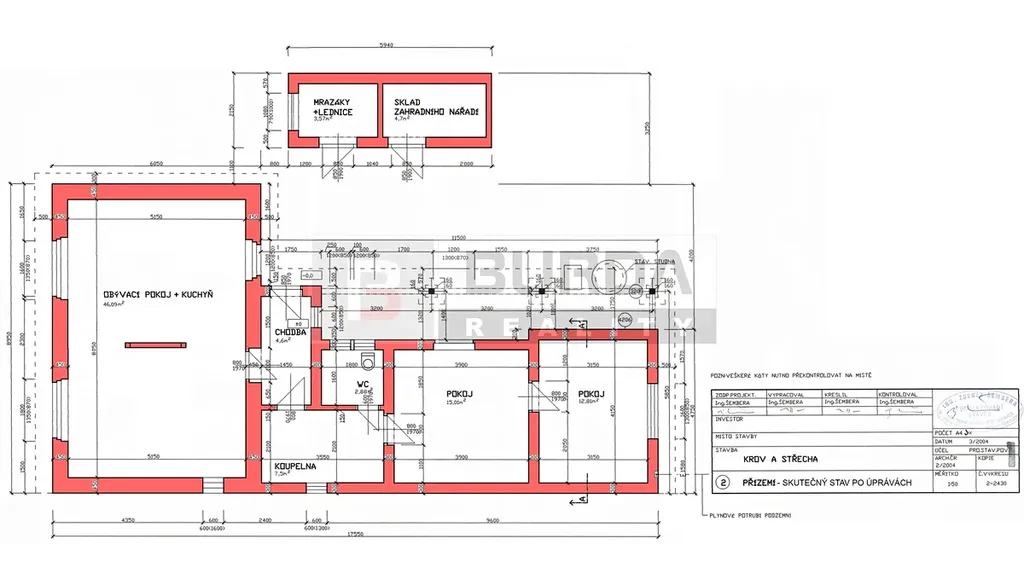 Půda nad obýv. pokojem je vhodná pro vestavbu 2 pokojů cca 40 m2, lze propojit vnitřními schody v obývacím pokoji.