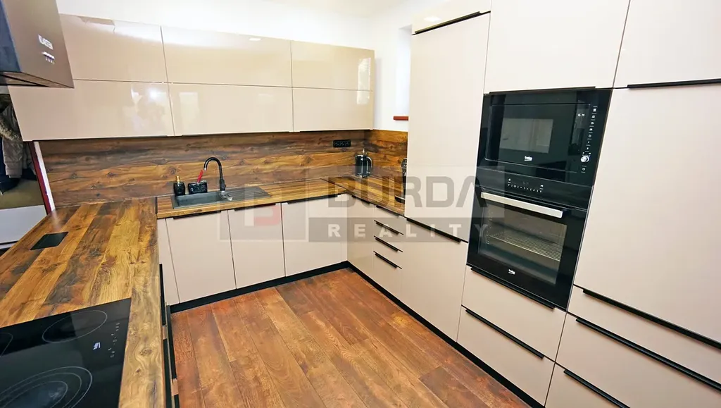Kuch. linka je vyrobena na míru, v lesklém laminu v odstínu capuccino, s prostornou pracovní plochou s dostatkem místa pro vaření s granitovým dřezem Alveus a s vestavěnými spotřebiči: myčka, lednice, mrazák Whirpool, menší lednice Amica, trouba, mikrovlnka a sklokeramická deska Beko a digestoř Klarstein.