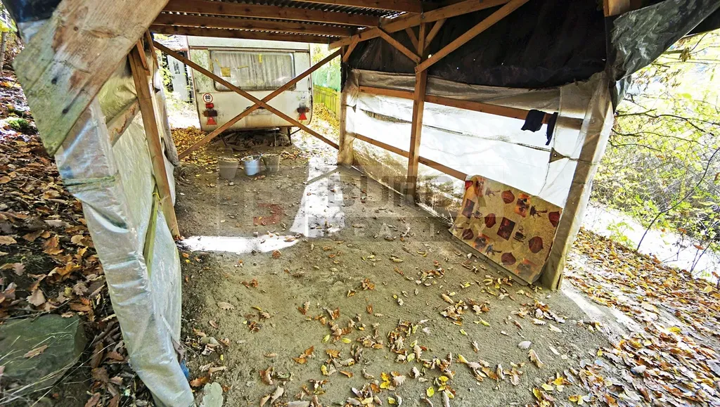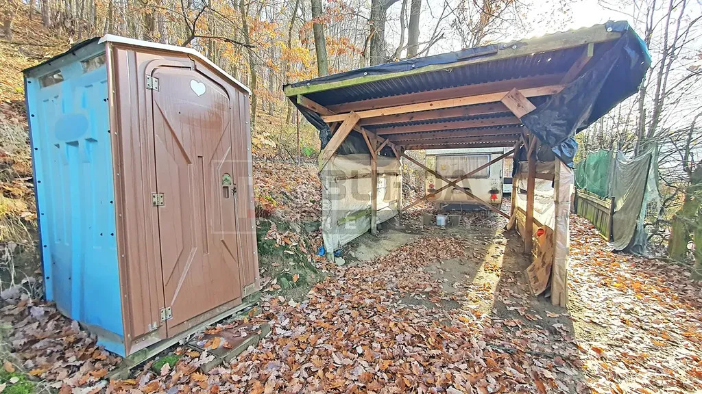Na pozemku se nachází zastřešené parkovací stání, obytný přívěs, chata 2+1 a dvě kůlny za chatou.