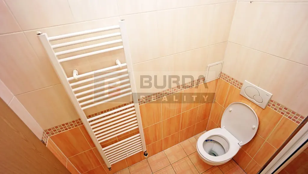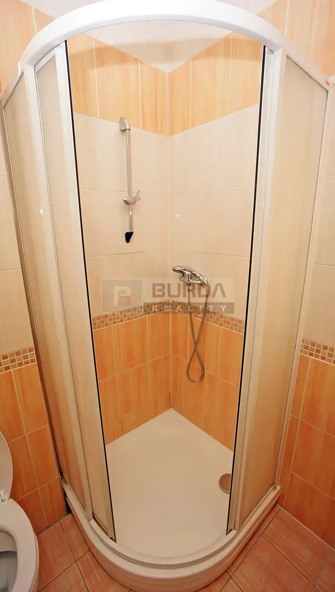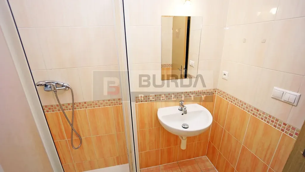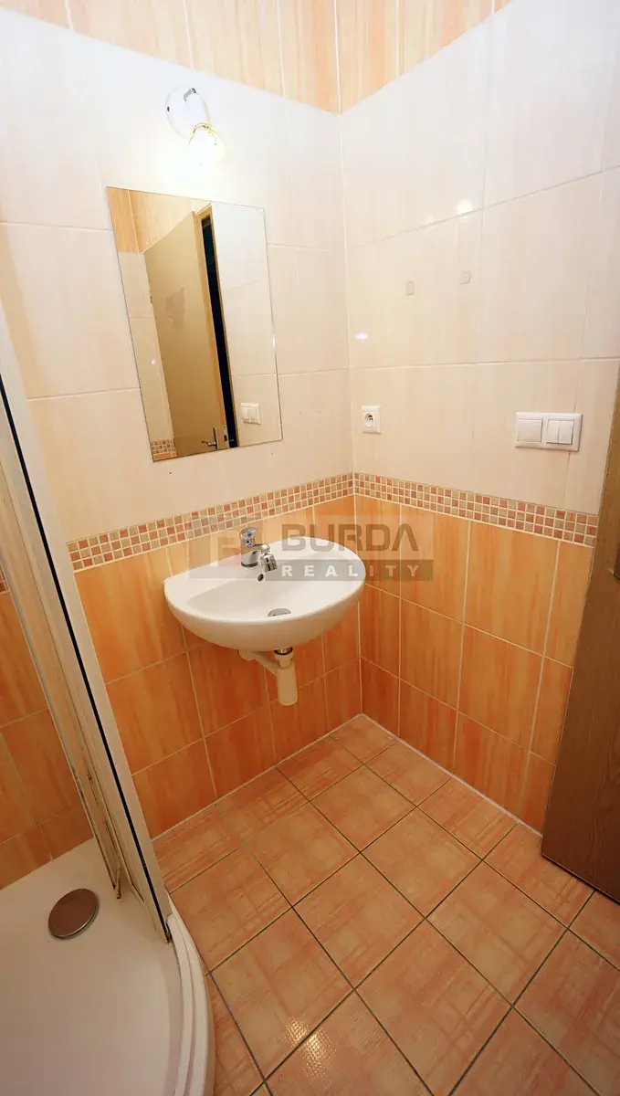 Koupelna je vybavena sprchovým koutem Ravak, topným žebříkem, zavěšeným WC Geberit, umyvadlem Kolo a zrcadlem.