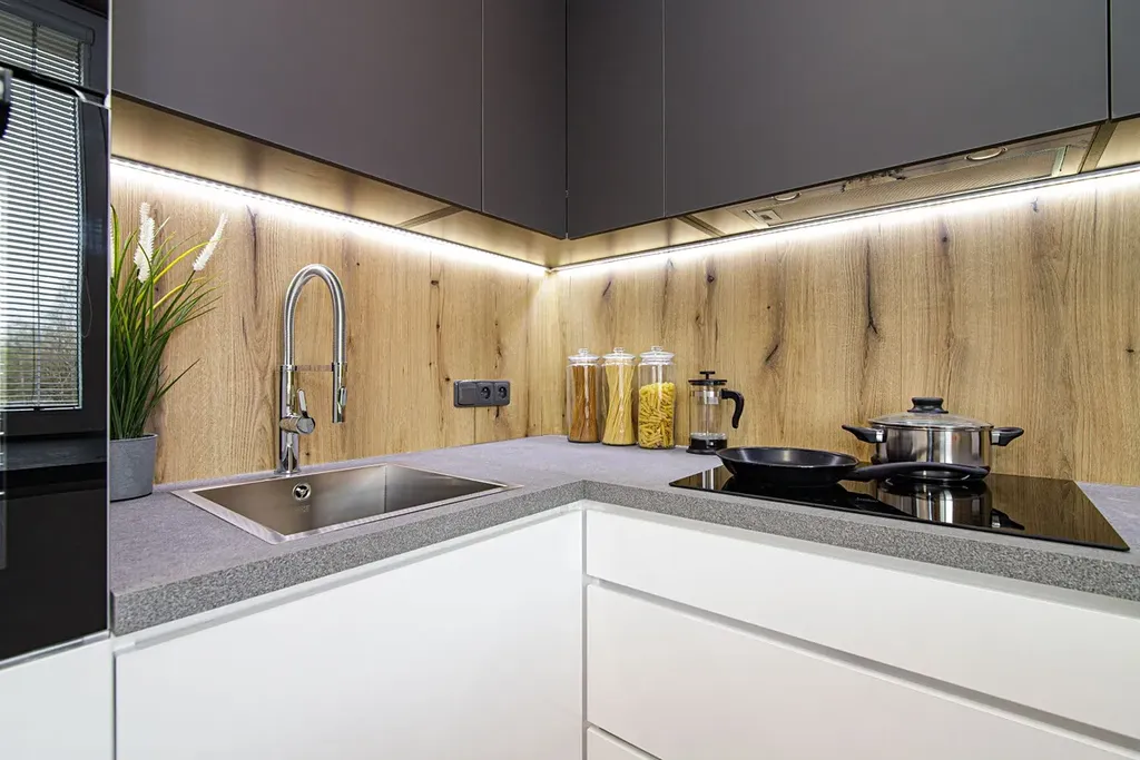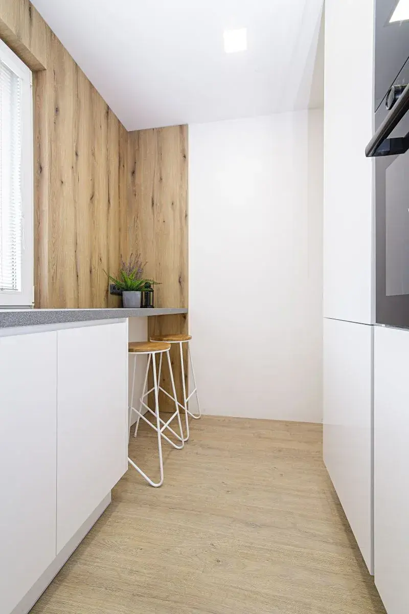 Byt není zařízen. V kuchyňské lince se nachází všechny potřebné vestavěné spotřebiče včetně pračky.