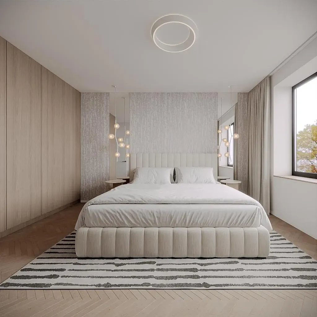 Dispozice bytu je promyšlená s ohledem na komfortní každodenní fungování. Vstupní chodba ústí do vzdušného obývacího pokoje s kuchyňskou linkou a jídelní zónou. Kuchyně je řešená podél stěny, poskytuje dostatek pracovního prostoru a plynule navazuje na obývací část. Z obývacího pokoje se vstupuje do ložnice orientované do klidné části domu. Pokoj nabízí dost místa pro manželskou postel i kvalitní úložné řešení.