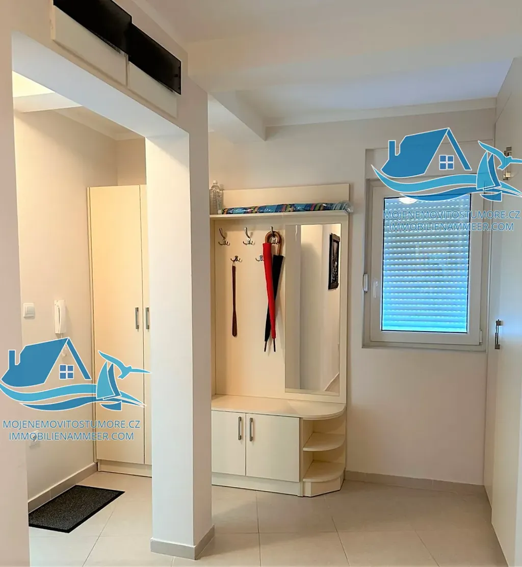 Dispozice: obývací pokoj s jídelnou kombinovanou s otevřenou kuchyní, tři ložnice, 2 koupelny a prostorná terasa s panoramatickým výhledem na moře a město.