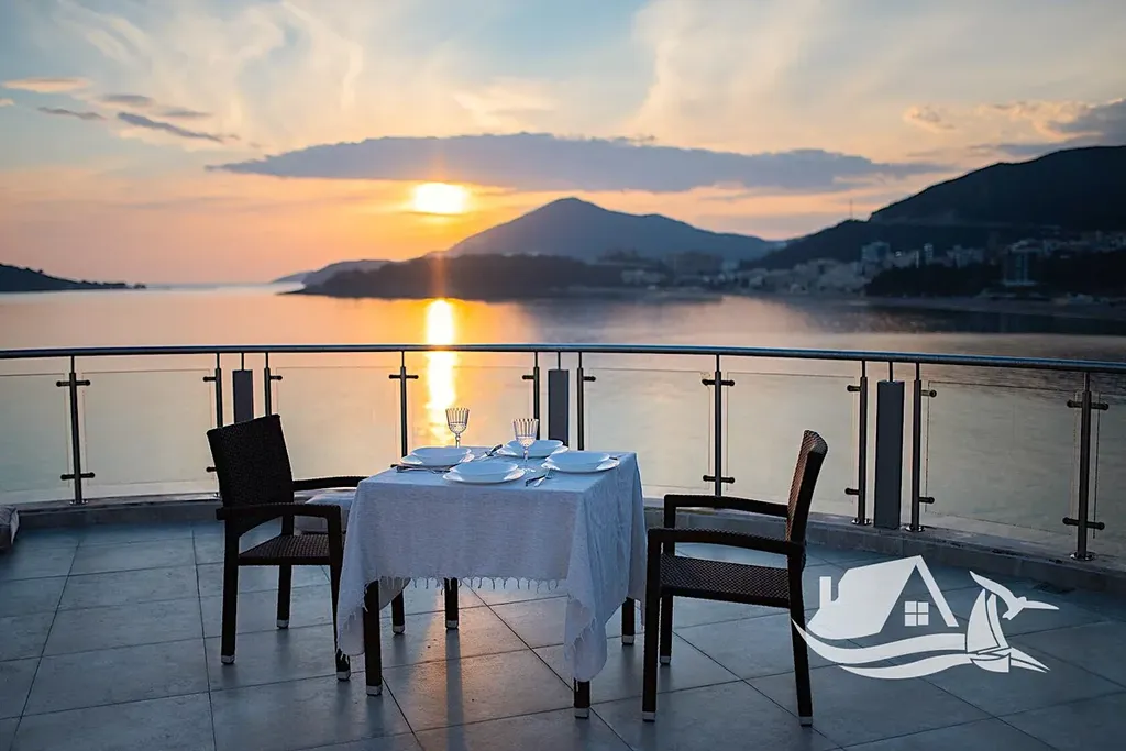 Apartmán má celkovou plochu 180 m² a je navržen s důrazem na pohodlí a praktičnost. Nacházejí se zde dvě prostorné ložnice a velká koupelna s luxusním sprchovým koutem. Hlavní chloubou této nemovitosti je terasa o rozloze 83 m², která nabízí jedinečné výhledy na hlavní atrakce regionu: ikonický ostrov Sveti Stefan, ostrov Sveti Nikola (známý jako Školský ostrov), majestátní balkánské hory a krásnou promenádu. Celý apartmán je plně zařízen a vybaven moderními spotřebiči, což umožňuje okamžité nastěhování.