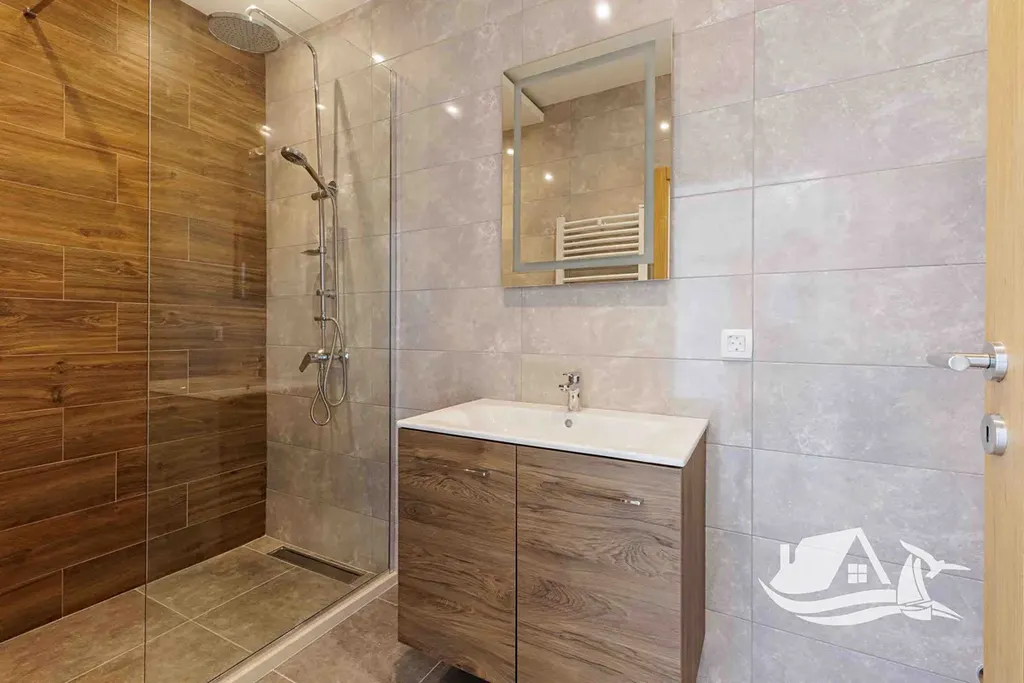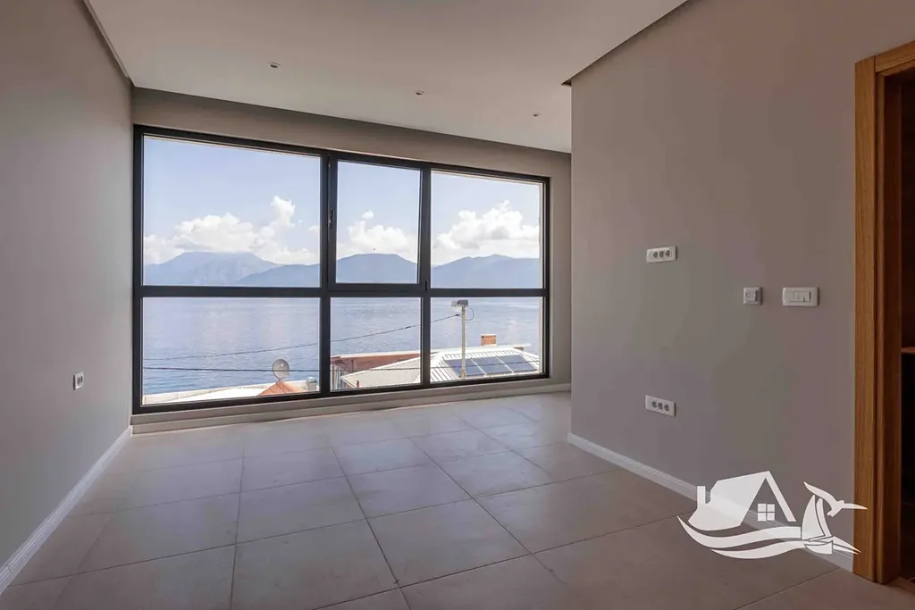 Druhé podlaží: Světlý obývací pokoj spojený s jídelnou a moderní kuchyní (34 m²), chodba (11 m²), koupelna se sprchovým koutem (4,4 m²) a schodiště vedoucí na třetí podlaží. Na tomto patře se nachází i velká terasa s bazénem o rozloze 48 m², kde si můžete užívat nádherný výhled na záliv.