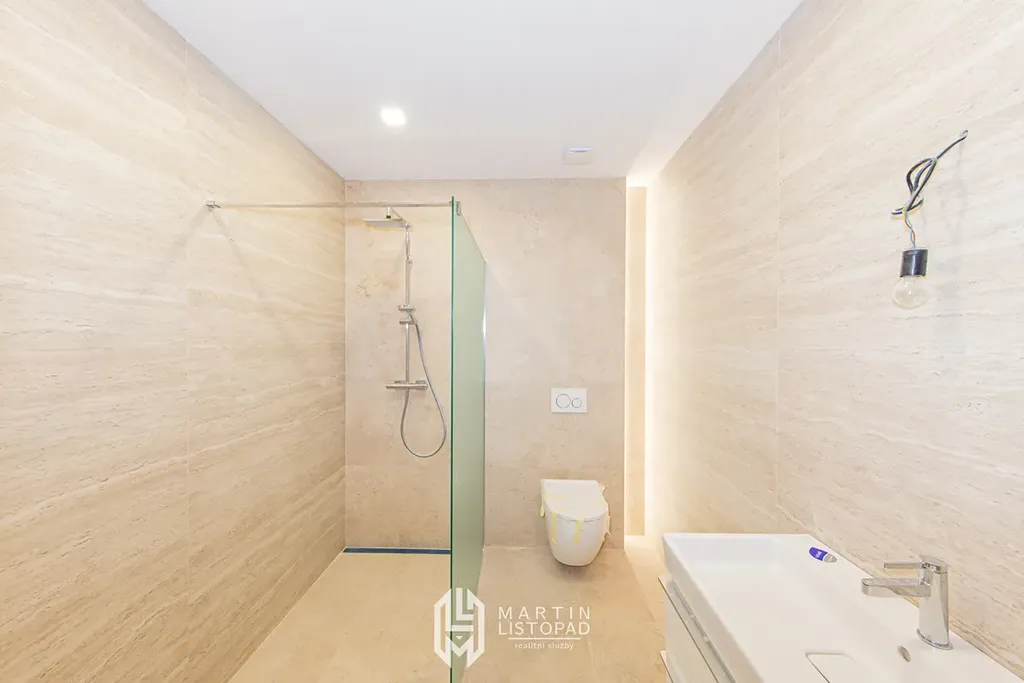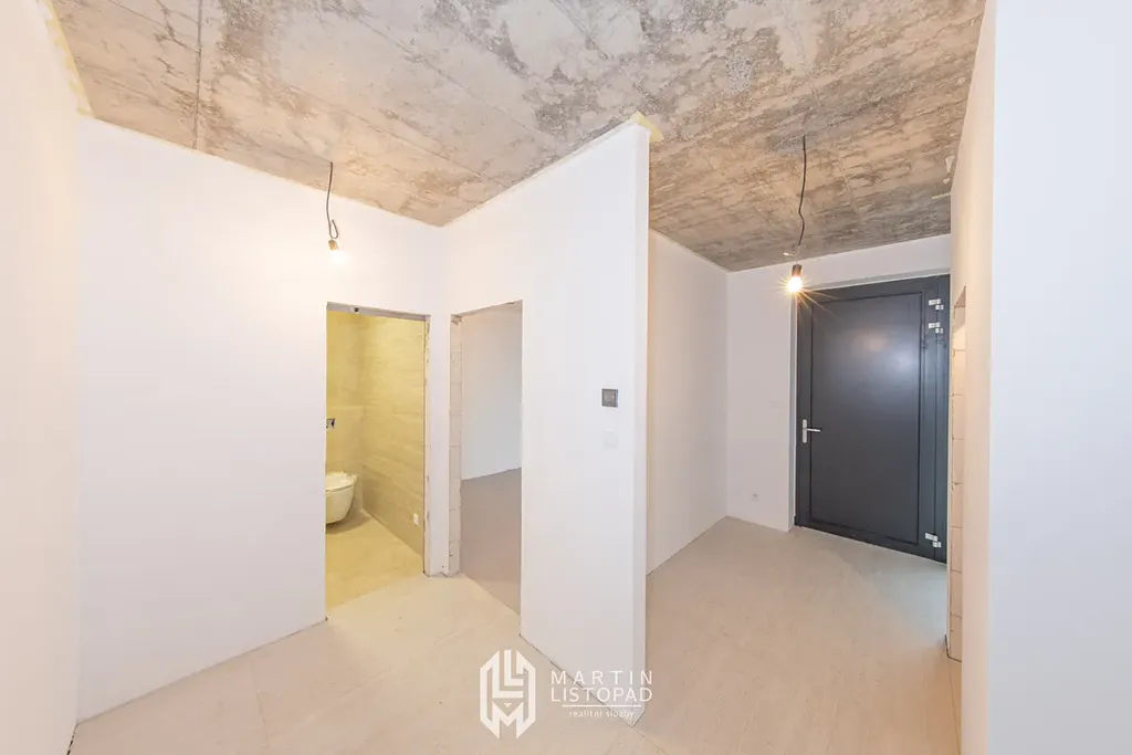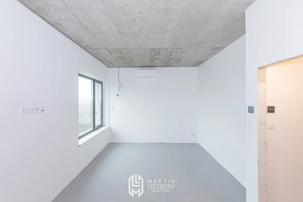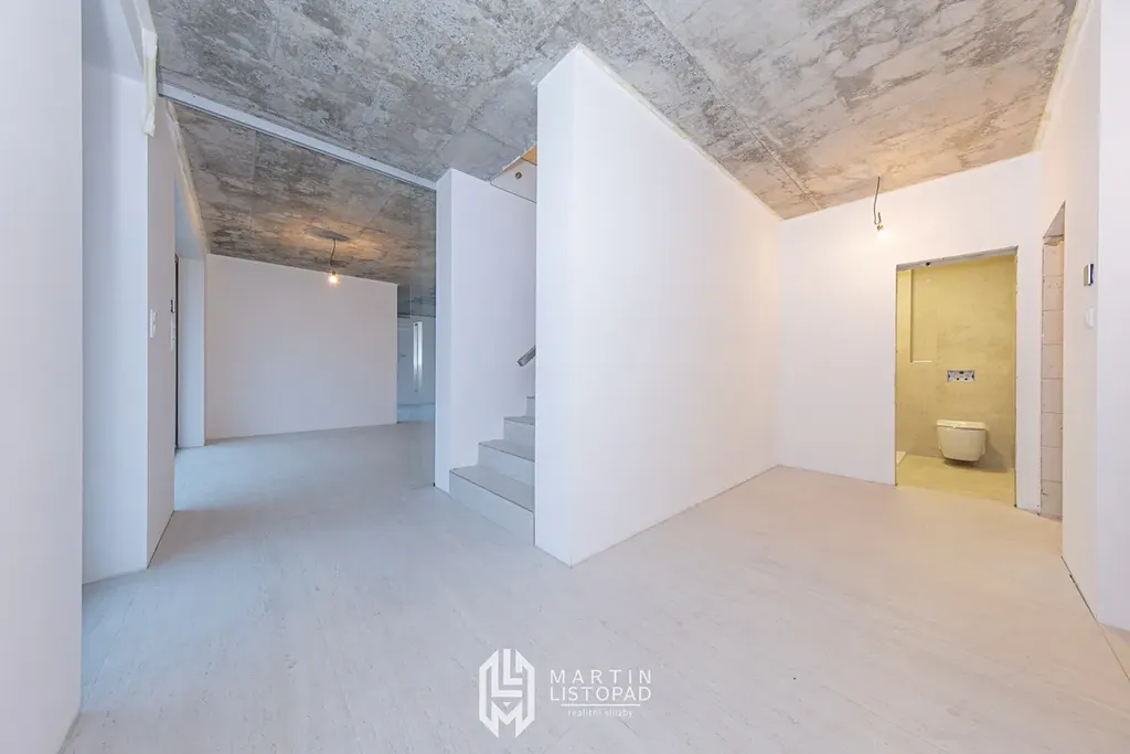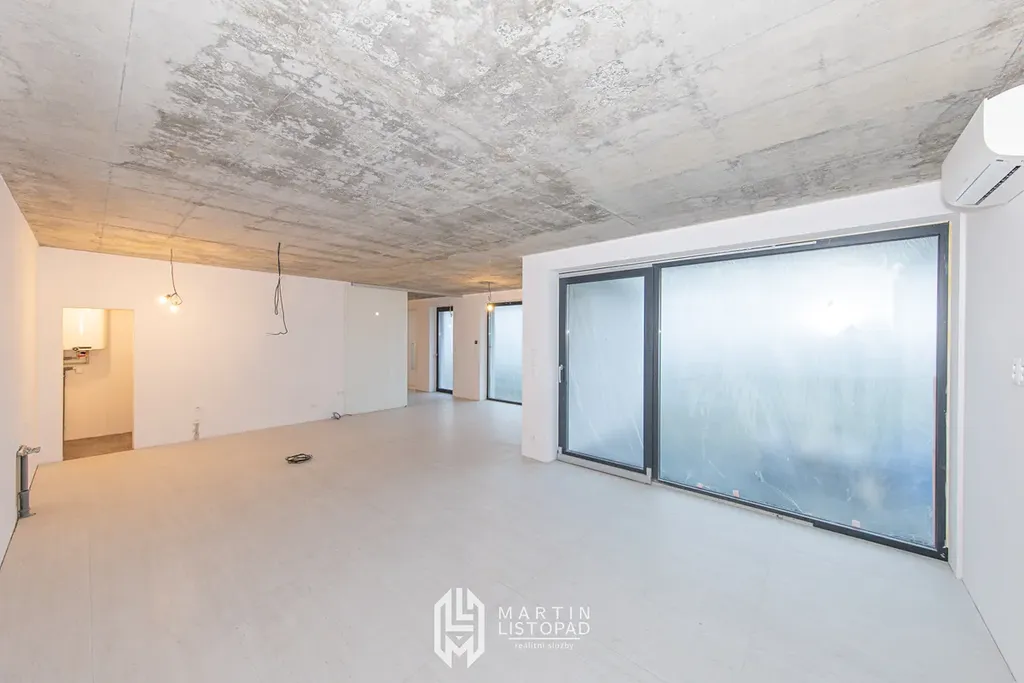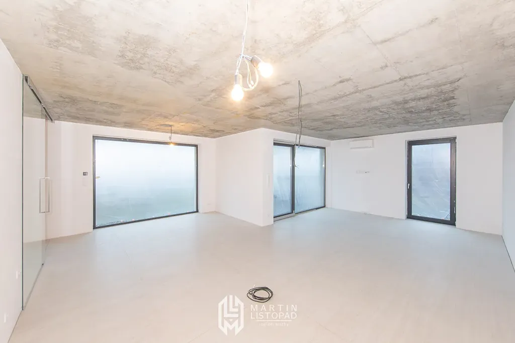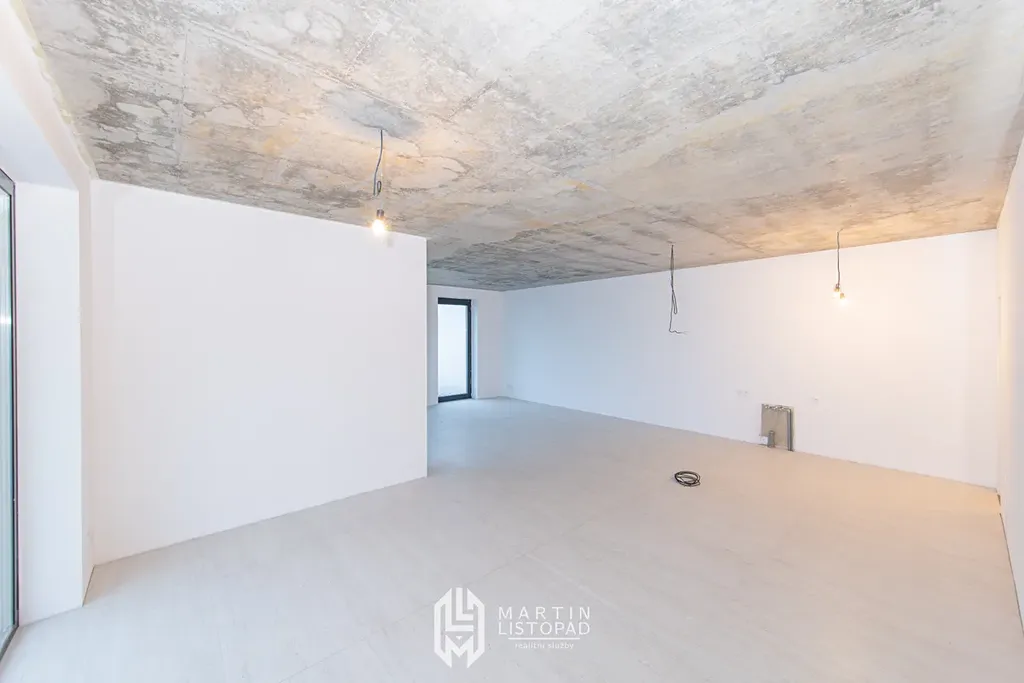 Vizuální dominantou interiéru jsou přiznané betonové stropy, které elegantně kontrastují s designovou velkoformátovou dlažbou. Ta je použita nejen v koupelnách, ale také v obývacím prostoru propojeném s kuchyňským koutem a na chodbách. V obytných místnostech je instalována kvalitní vinylová podlaha.