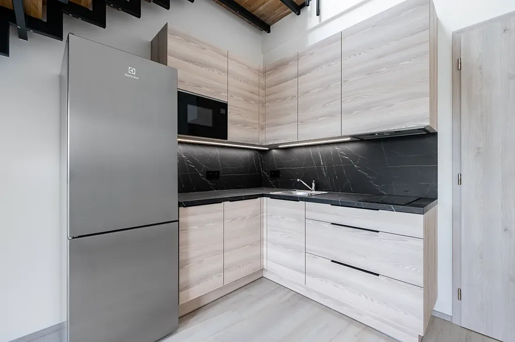 Nový loftový byt 2+kk o celkové výměře 38,5 m2 se nachází v 3. NP. Byt je orientován do klidné části. Jednotka disponuje v dolním patře prostorným obývacím pokojem, vybaveným novou značkovou nadstandardní vestavěnou kuchyňskou linkou včetně kvalitních spotřebičů a samostatnou neprůchozí ložnicí v horním patře. Koupelna má sprchový kout, pračku a je spojená s WC. Předsíň nabízí instalovanou šatní skříň. Byt se pronajímá částečně zařízený.