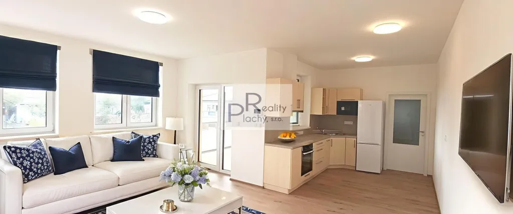 Interiér je navržen s důrazem na funkčnost. Z předsíně vstoupíte do vzdušného obývacího pokoje s kuchyňským koutem, vybaveným kvalitní linkou a vestavnými spotřebiči. Velkou předností prostoru je krytá terasa, která díky svému rozměru působí téměř jako další místnost a poskytuje perfektní zázemí pro odpočinek i posezení s přáteli.