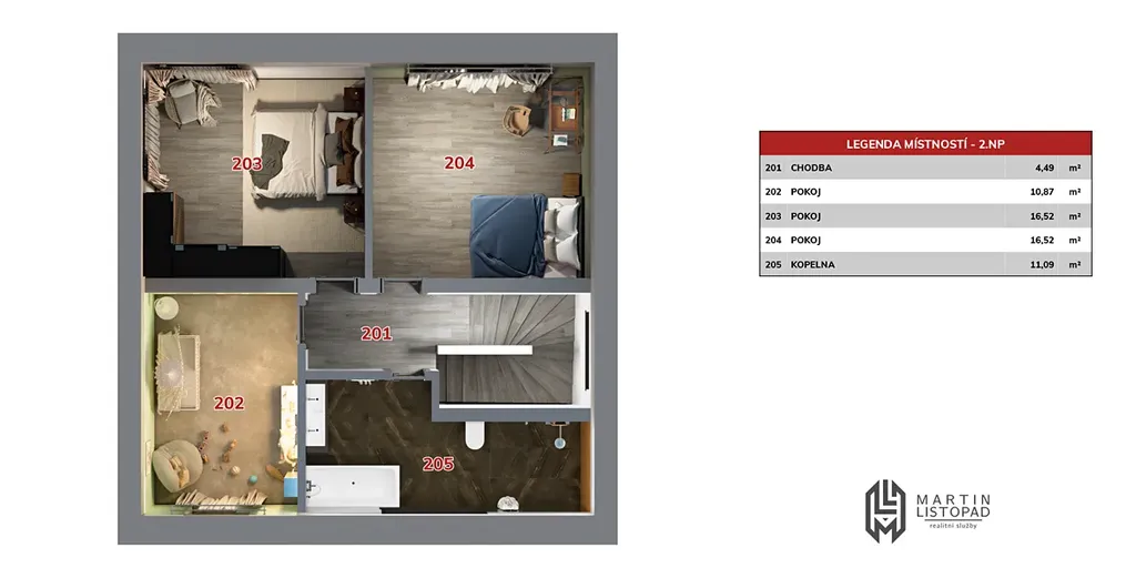 Ve 2. NP je hlavní ložnice, dva neprůchozí pokoje a prostorná koupelna se sprchovým koutem, vanou a toaletou.