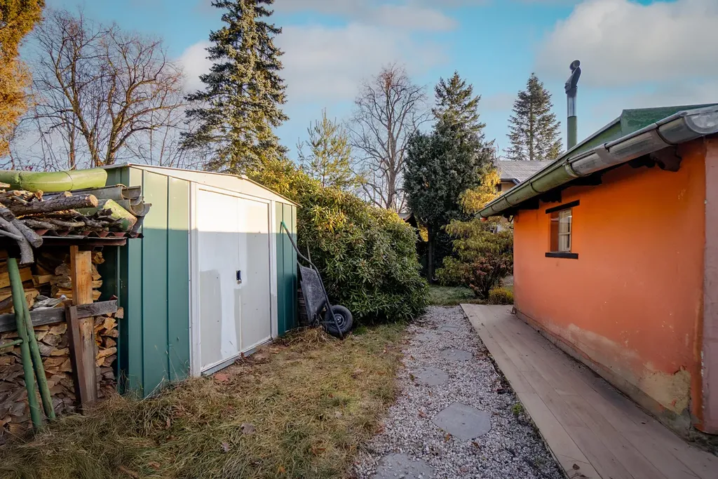 V horní části pozemku jsou dva domky na nářadí, pozemek oplocen.