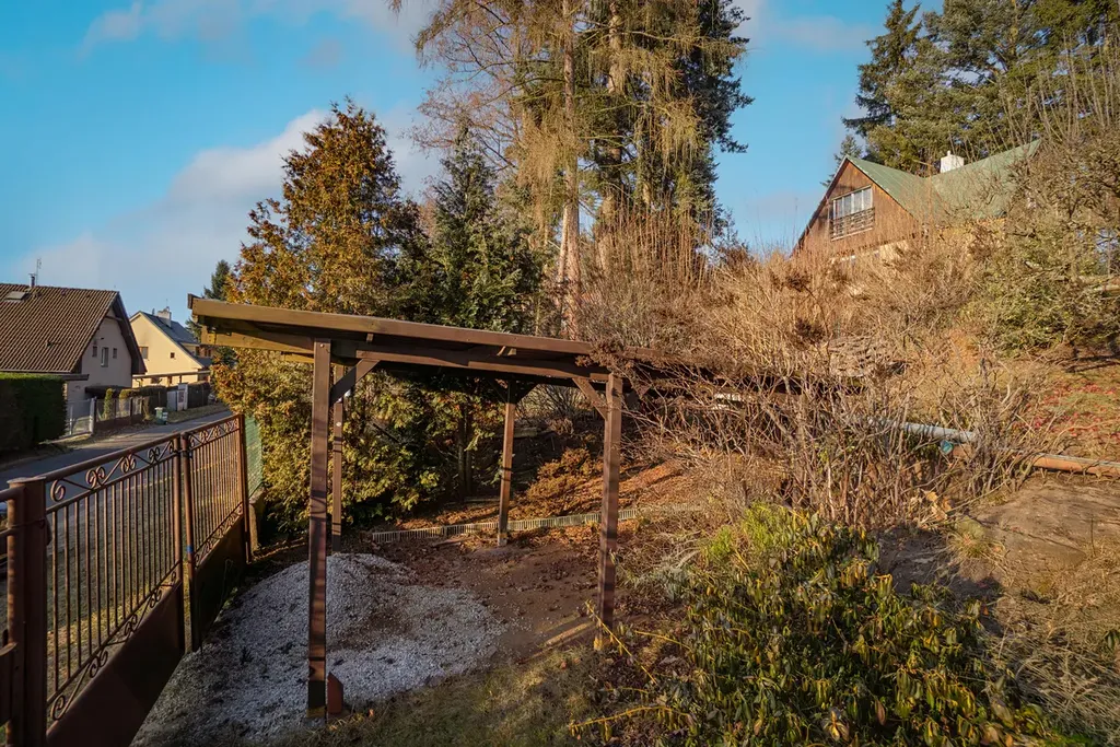 Na pozemku je upravené kryté parkovací stání s vjezdem přímo z ulice.