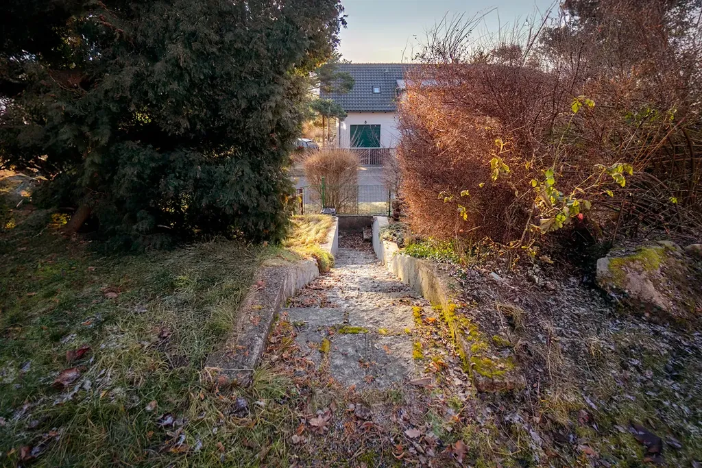 Pozemek je osázen vzrostlou zelení, velký rododendron potěší každé jaro, ovocné keře i stromy již plodí.
