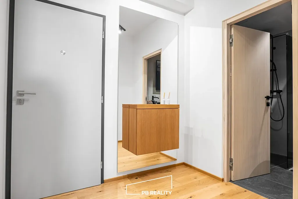 Dřevěná podlaha, podsvícená kuchyňská linka včetně spotřebičů v minimální hodnotě 300 000,-Kč s italskou stěrkou Travertino Romano, prostorná koupelna též kompletně v italské stěrce Travertino Romano s vanou a walk – in sprchou, na zakázku šité black-out závěsy v celém bytě, podsvícená skleněná příčka a zakázková skříňová sestava.