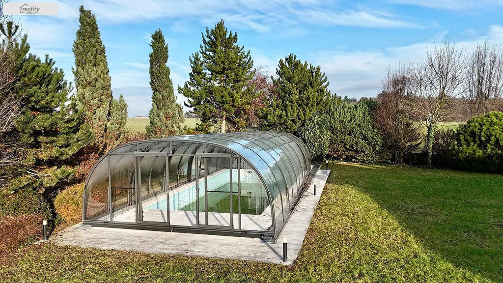 Zahrada, Krytý vyhřívaný bazén se slanou vodou a parkování s dílnou.
